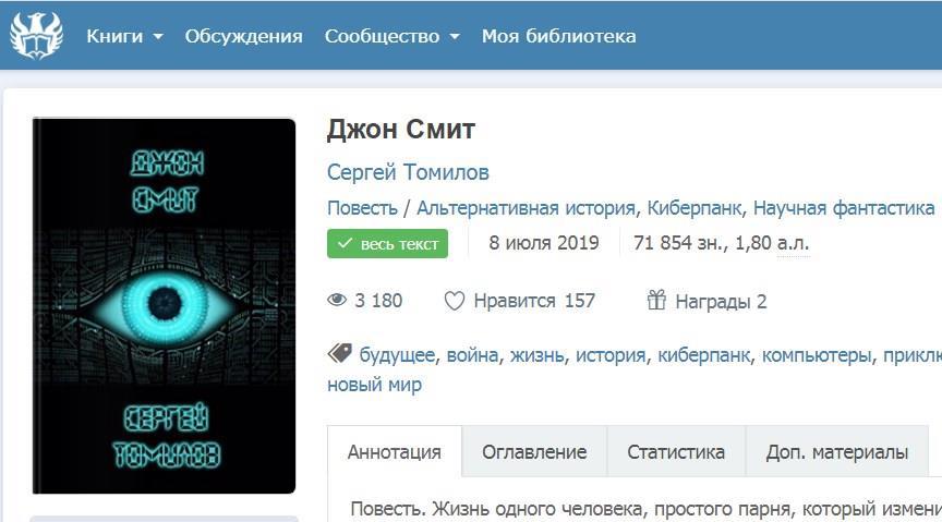 Автор: Серж ТомиловСвежее обновление позволило сделать произведение «Джон Смит» соответствующей формой — а то висело две алки романом несколько лет как бельмо на глазу. Может даже отдам эту старую и слабую клячу на препарирование редактурой.