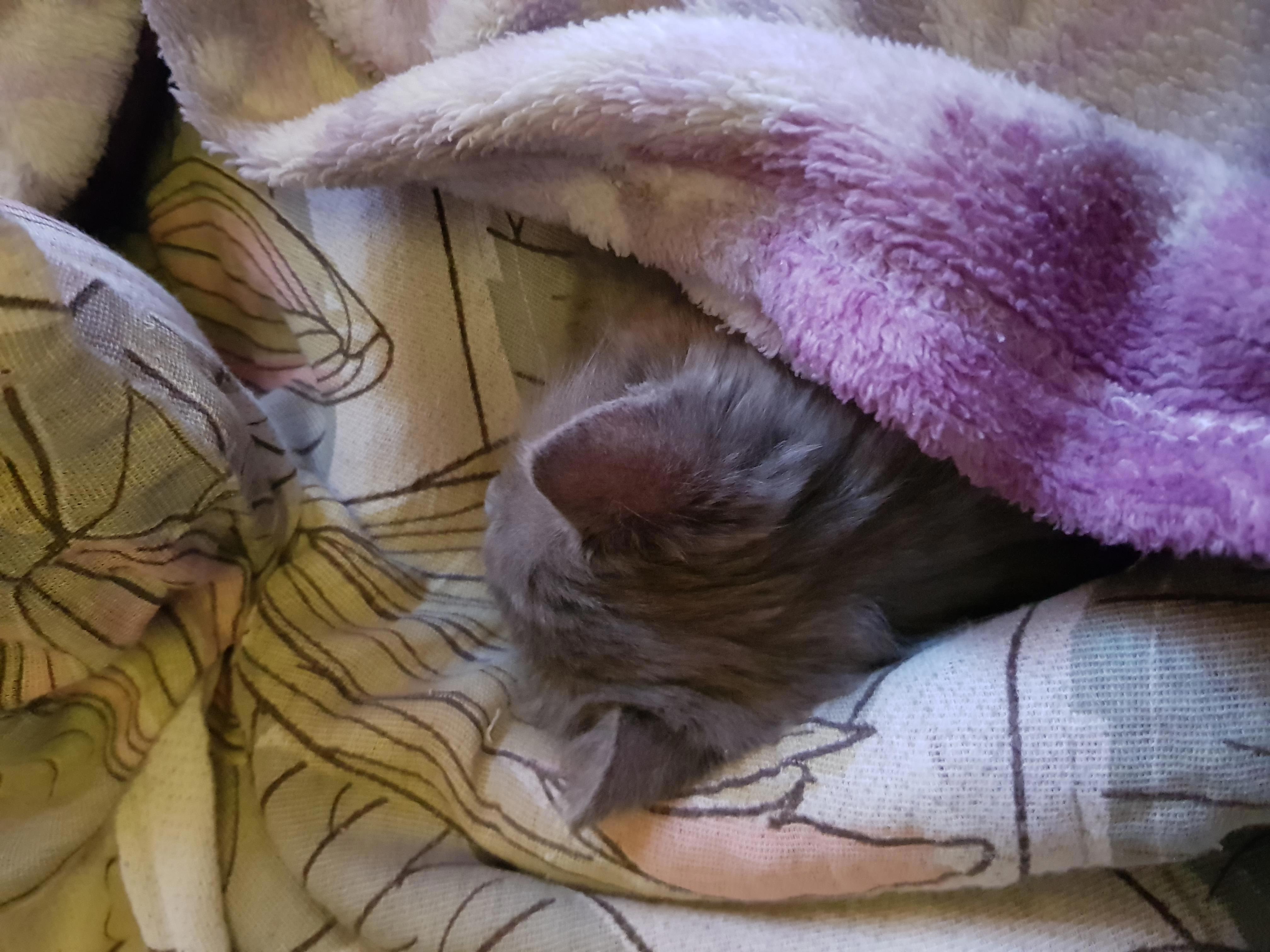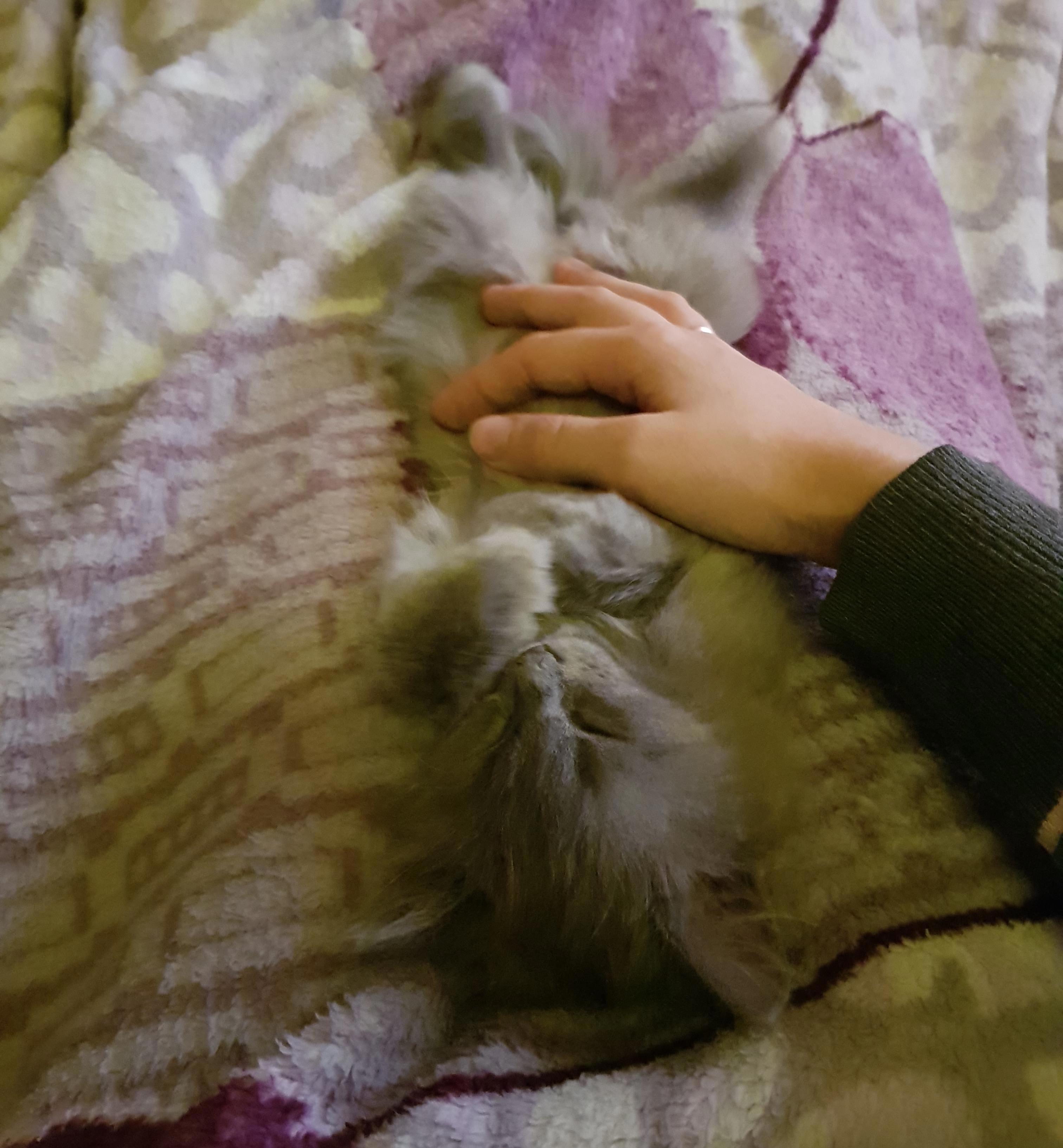 У нас радостная новость — в нашей маленькой семье произошло пополнение. Спонтанное пополнение. Как-то раз, возвращаясь из аптеки, возле соседнего дома заметила серенький комочек. Захотелось взглянуть поближе. Вдруг юрк! он скрылся под машиной. Заглянув под машину, увидела крохотную мордочку с большими от страха глазами. Я подозвала, но котёнок остался неподвижным.