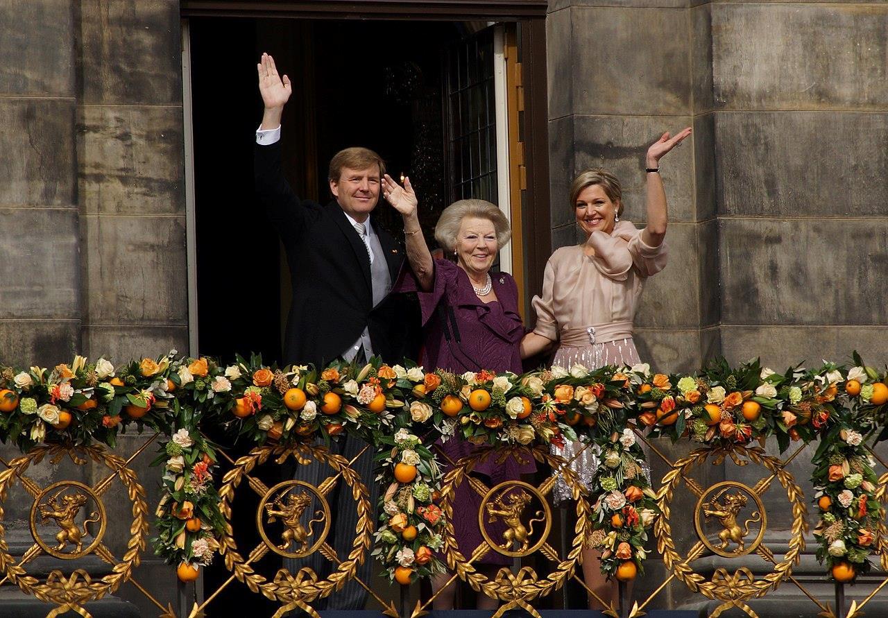 Король Виллем-Александр, принцесса Беатрикс и королева Максима на балконе Королевского дворца в Амстердаме. 30 апреля 2013 года.