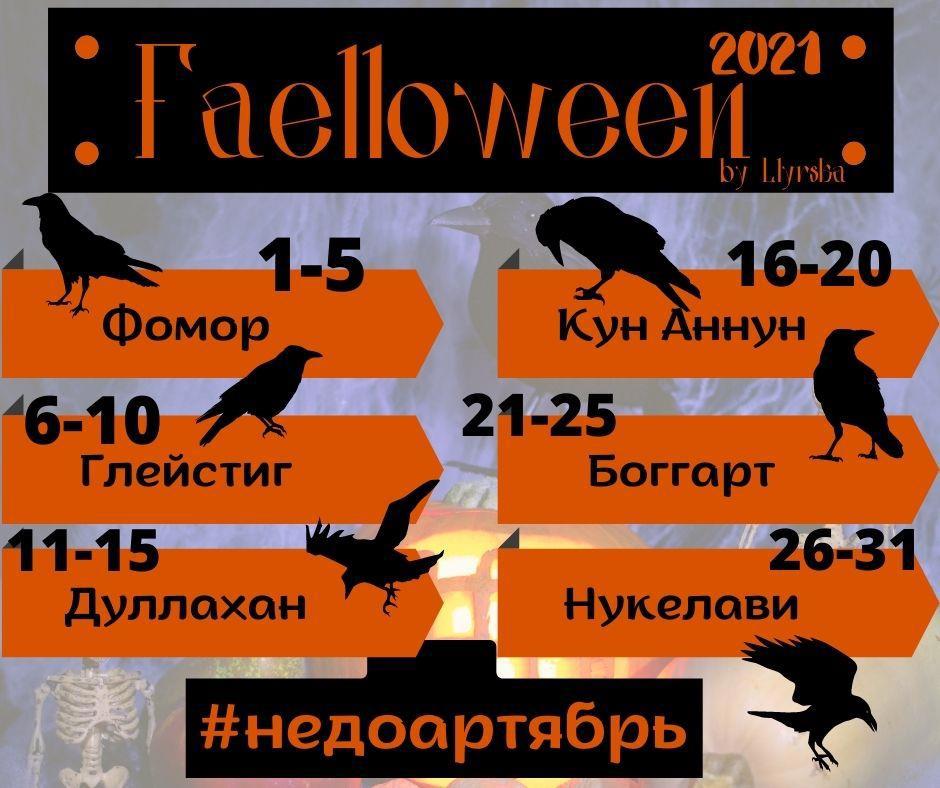 Собственно, это я всё к чему? Конечно, я немножко нацеливаюсь на Мифтобер, но, поскольку я именно что недохудожник (как, вероятно, и многие, кто меня читает), то 31 рисунок за месяц я точно не потяну. Поэтому формат «1-5» меня тоже привлекает. Вот я и подумала: а почему бы не замутить свой, совершенно неофициальный «недоартобер»? Например, Faelloween!