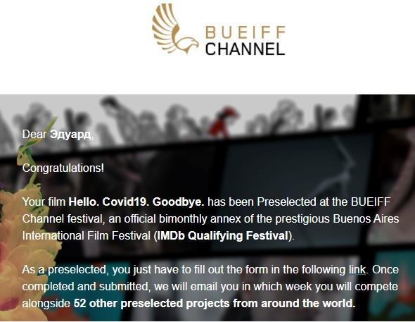 Кстати, мой фильм Hello.Covid19.Goodbye прошел еще на один кинофестиваль. На этот раз в Аргентине. В Буэнос-Айресе. И снова качество никого не смутило. Но это так, к слову.