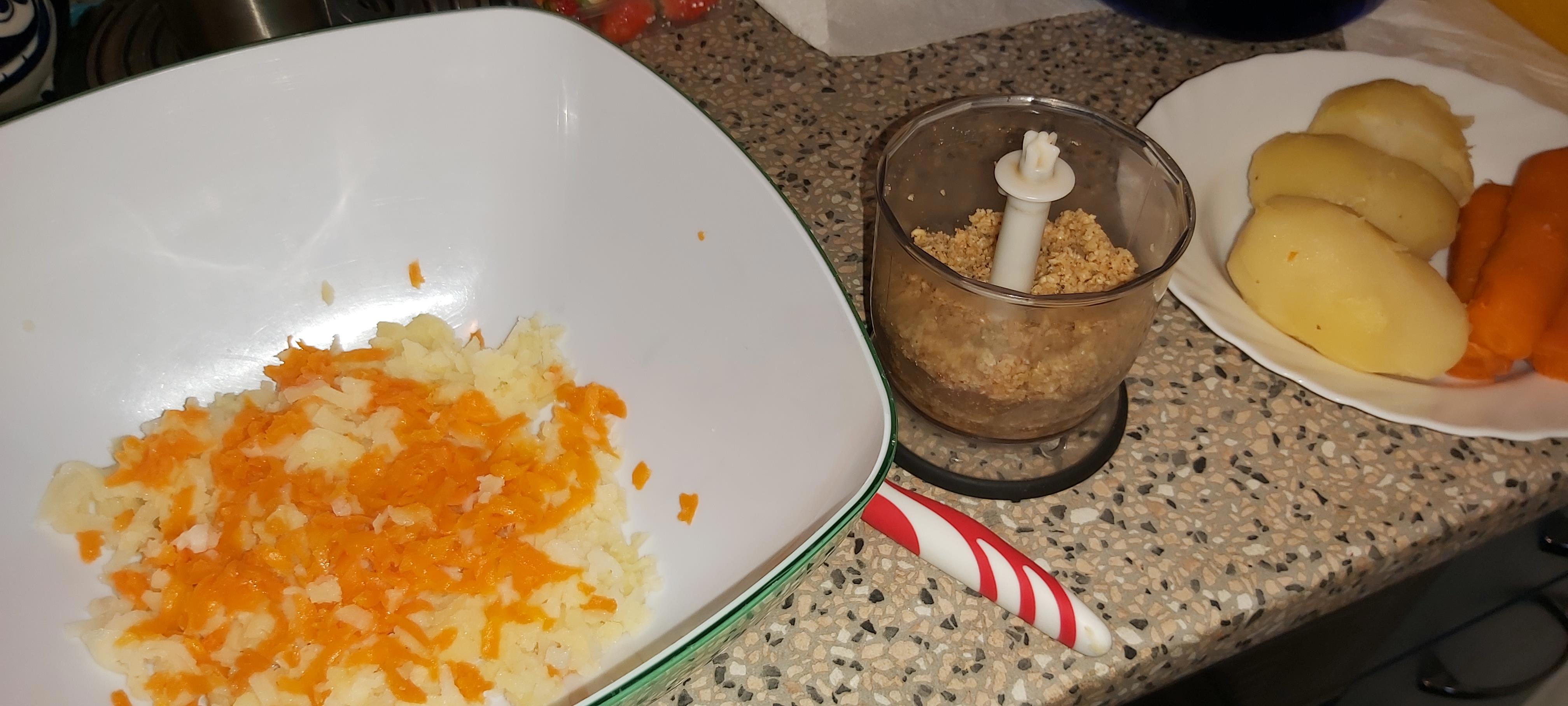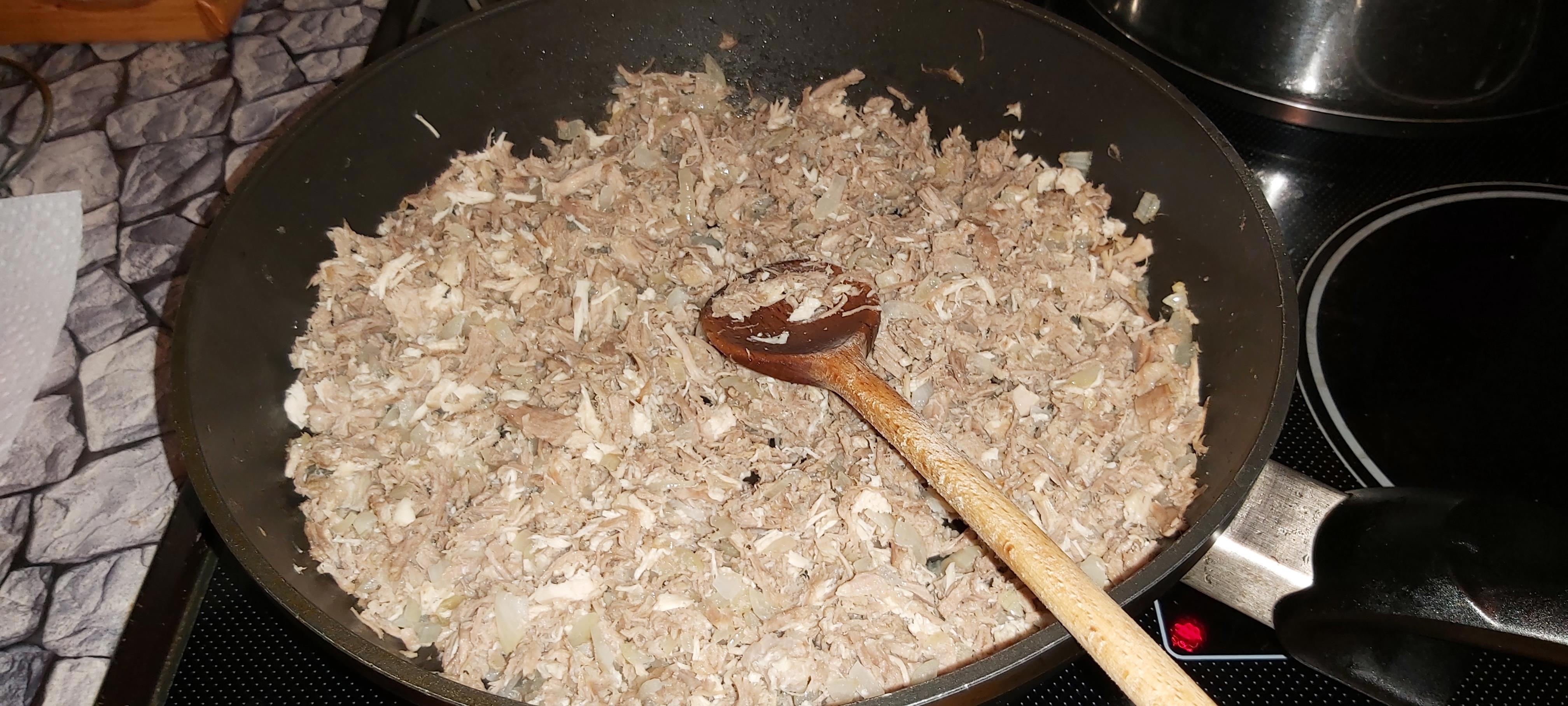 Свиное мясцо и немного куры с луком (сначала сварила) обжарила.