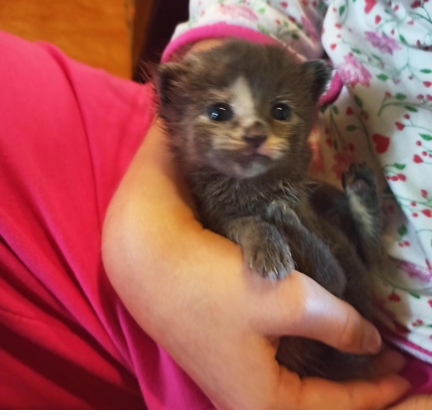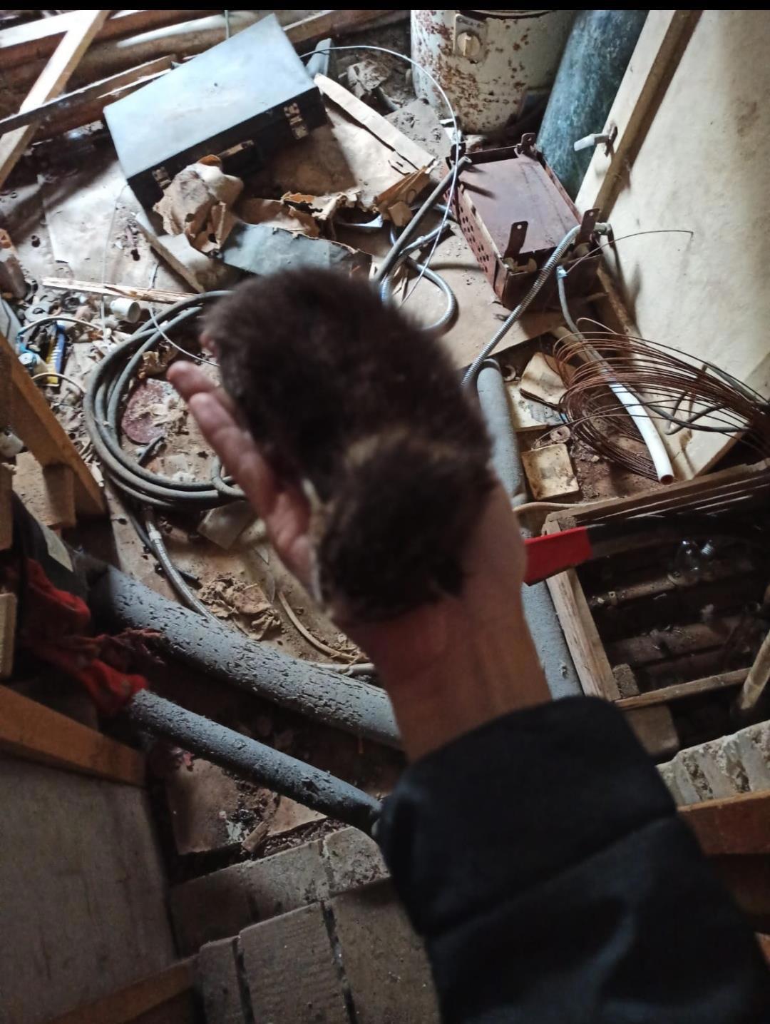 Хорошо, что шёл добрый человек по улице, и он принёс перфоратор и молоток. Мы сделали небольшое отверстие и через него где-то в 11-30 котёнка вытащили. Сразу стало понятно, отчего он по простыне не полз наверх. Это был молочный котёныш (я думала, что постарше по фото). Не иначе его мать, как самого слабого, из гнезда вот так выкинула, что у меня сердце разрывалось.