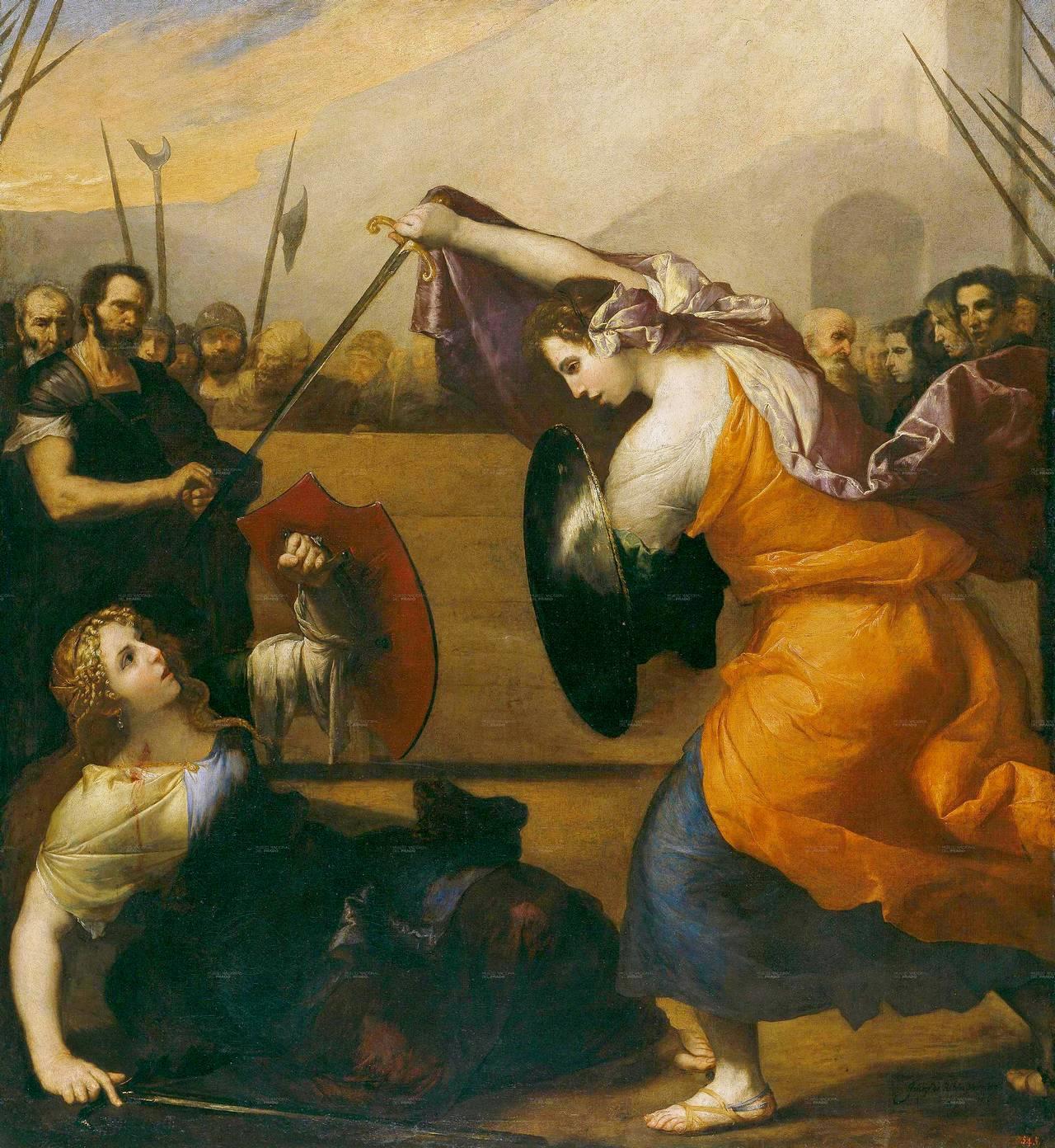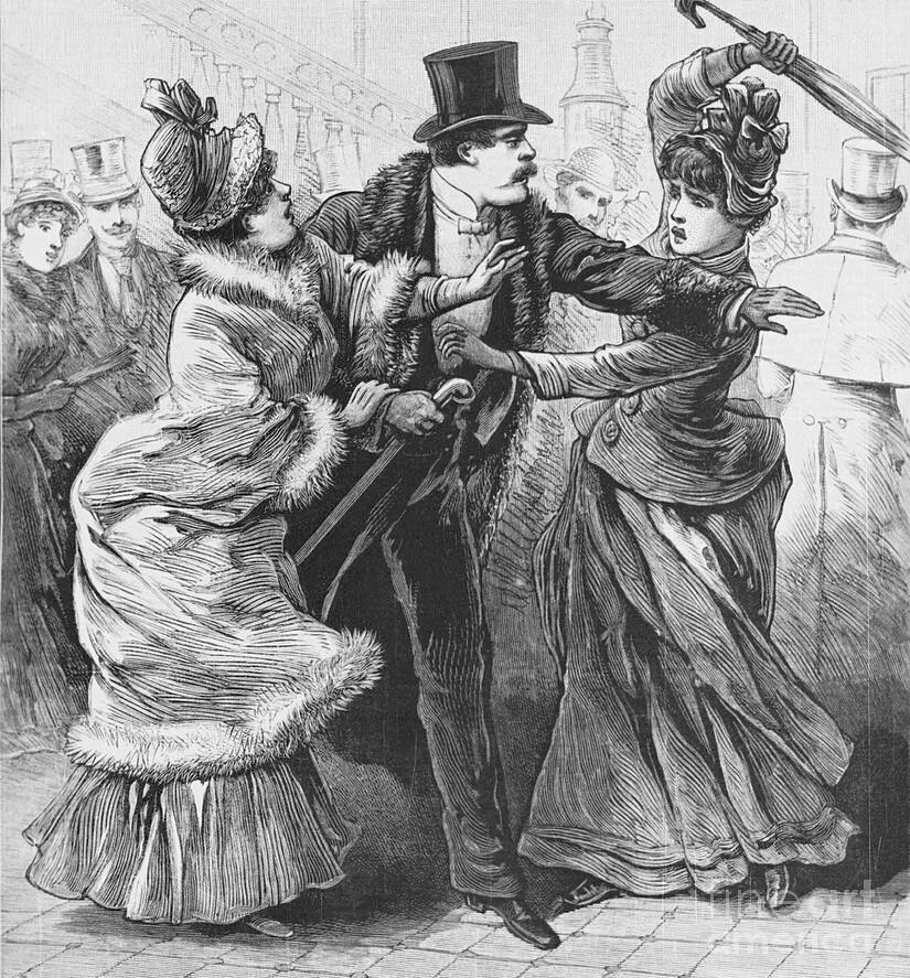 Потом женские дуэли то появлялись, то кровожадность дам удавалось как-то сдерживать, но совсем они не исчезали никогда. Так, например, в умиротворённом в целом Неаполе образца 1552 года не поделили некого Фабио де Зересола две дамы – Изабелла де Карази и Диамбра де Петинелла. Чтобы предмет спора не получил моральную травму, его оставили ждать решения дам, кому он достанется, а в качестве «рефери на ринге» пригласили настоящего мужика – маркиза де Васта. Бой кончился незначительными травмами дам и оглушительным успехом в общественных пересудах. В конце концов один из художников не выдержал и запечатлел это историческое событие на своём полотне, которое назвал очень неожиданно и творчески – «Женская дуэль»: