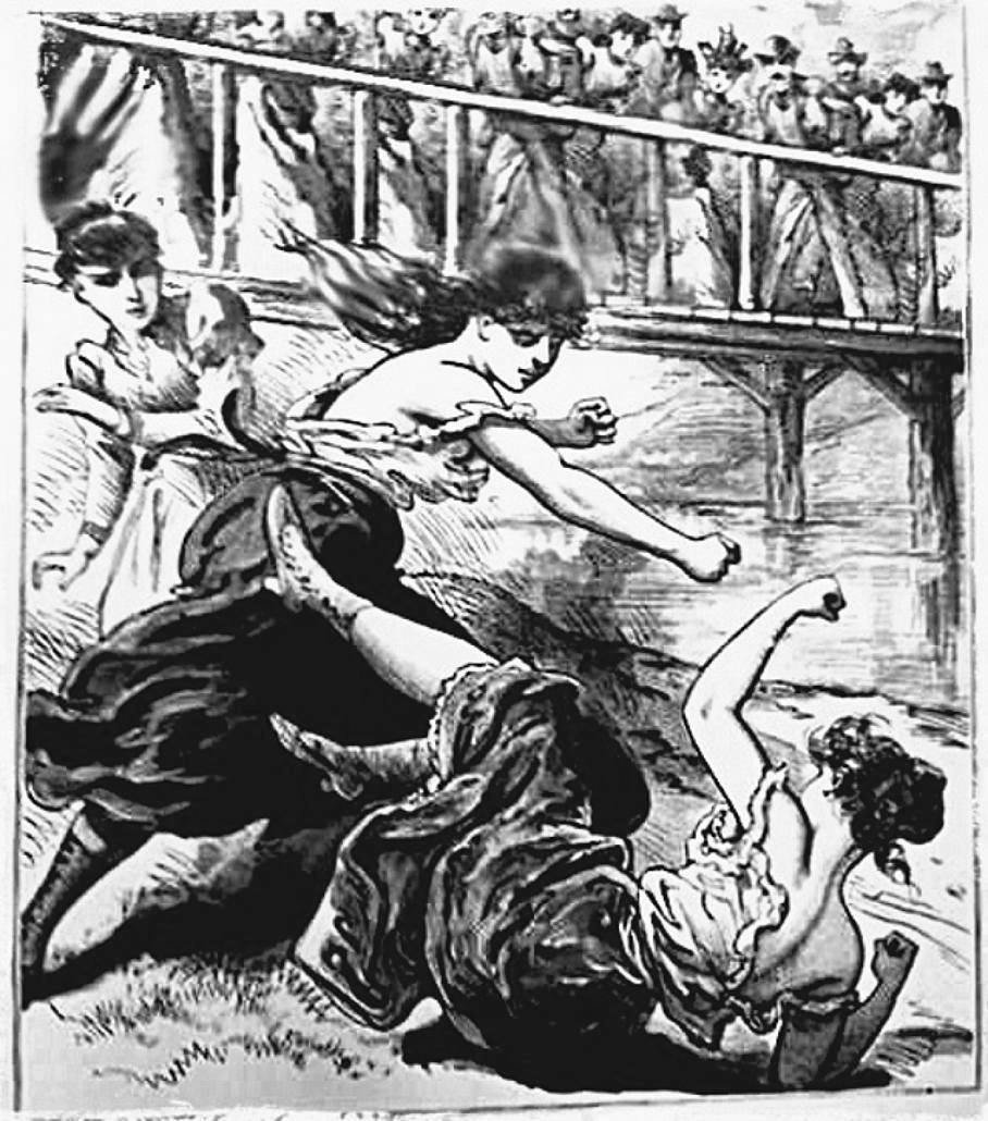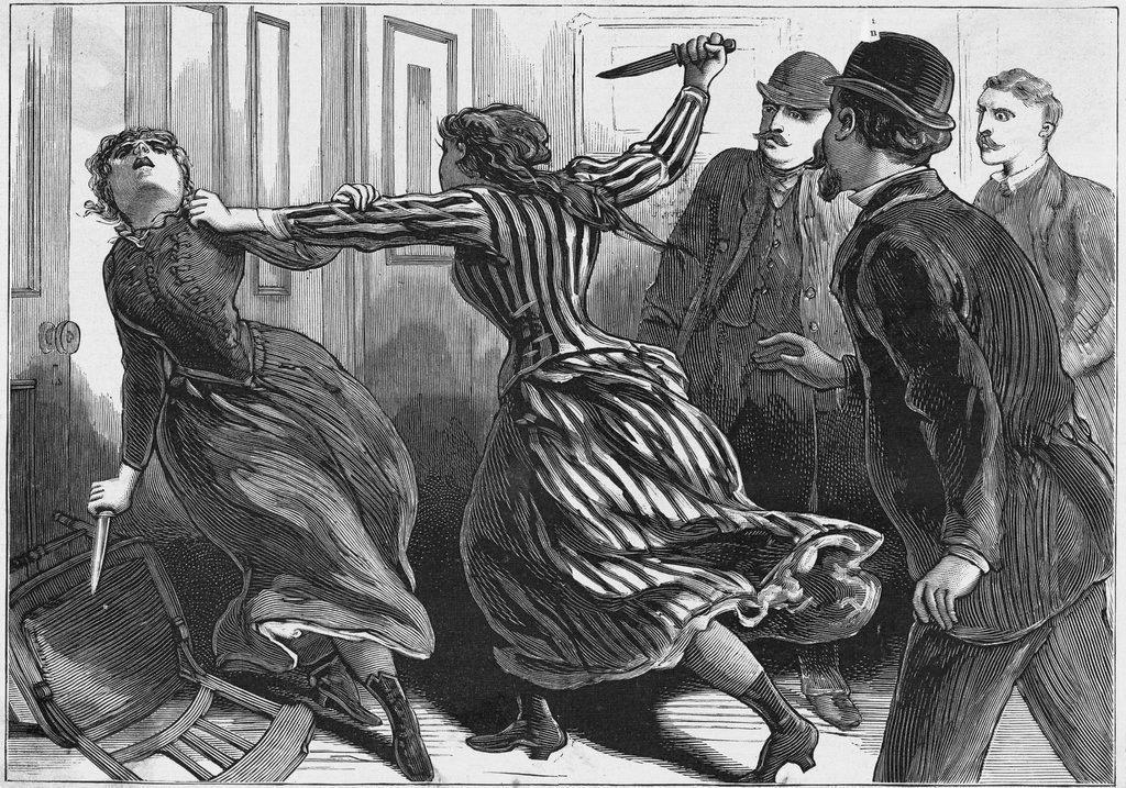 Понятно, что дамы из «низких сословий» тоже от недостатка кровожадности не страдали. Поединки проходили и там. Но условия всё же были немного другими. Вот где им было взять шпаги? Остаётся использовать более простые методики: