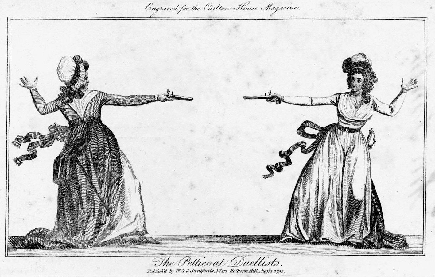 В Россию дикие европейские нравы завезла Екатерина №2, которая по молодости устроила разборку со своей троюродной сестрой. Глядя на неё, и наши дамы тоже начали упражняться в этом деле. Понятно, что в такой мирной и культурной стране, как Россия, такие действия вызвали только осуждение. В результате особо отмороженным дамам приходилось ездить для своих разборок в Европу. Так в 1770 году Екатерина Воронцова-Дашкова во время своего пребывания в Лондоне оторвалась на какой-то местной аристократке. В результате дамы, потыкав подруга в подругу шпагами, разошлись удовлетворёнными… выпустили пар, так сказать.