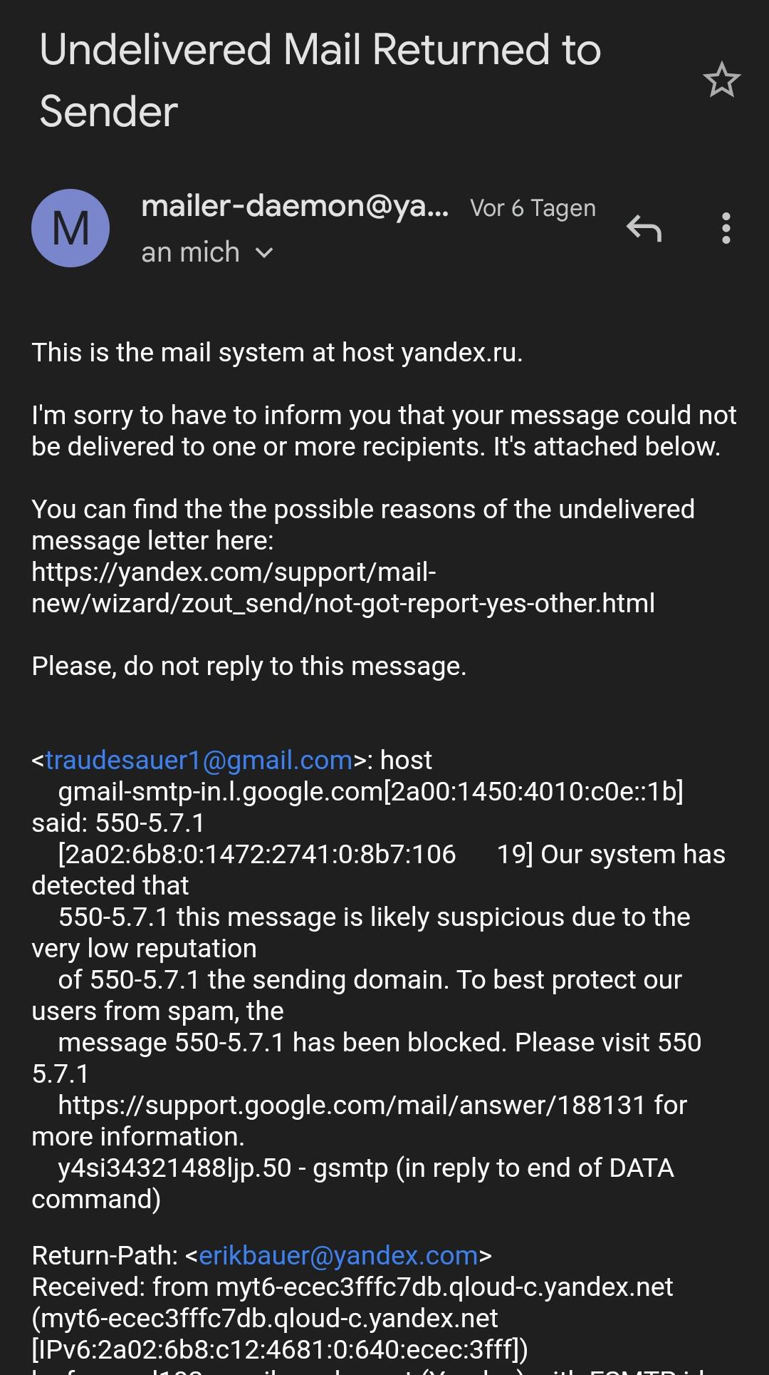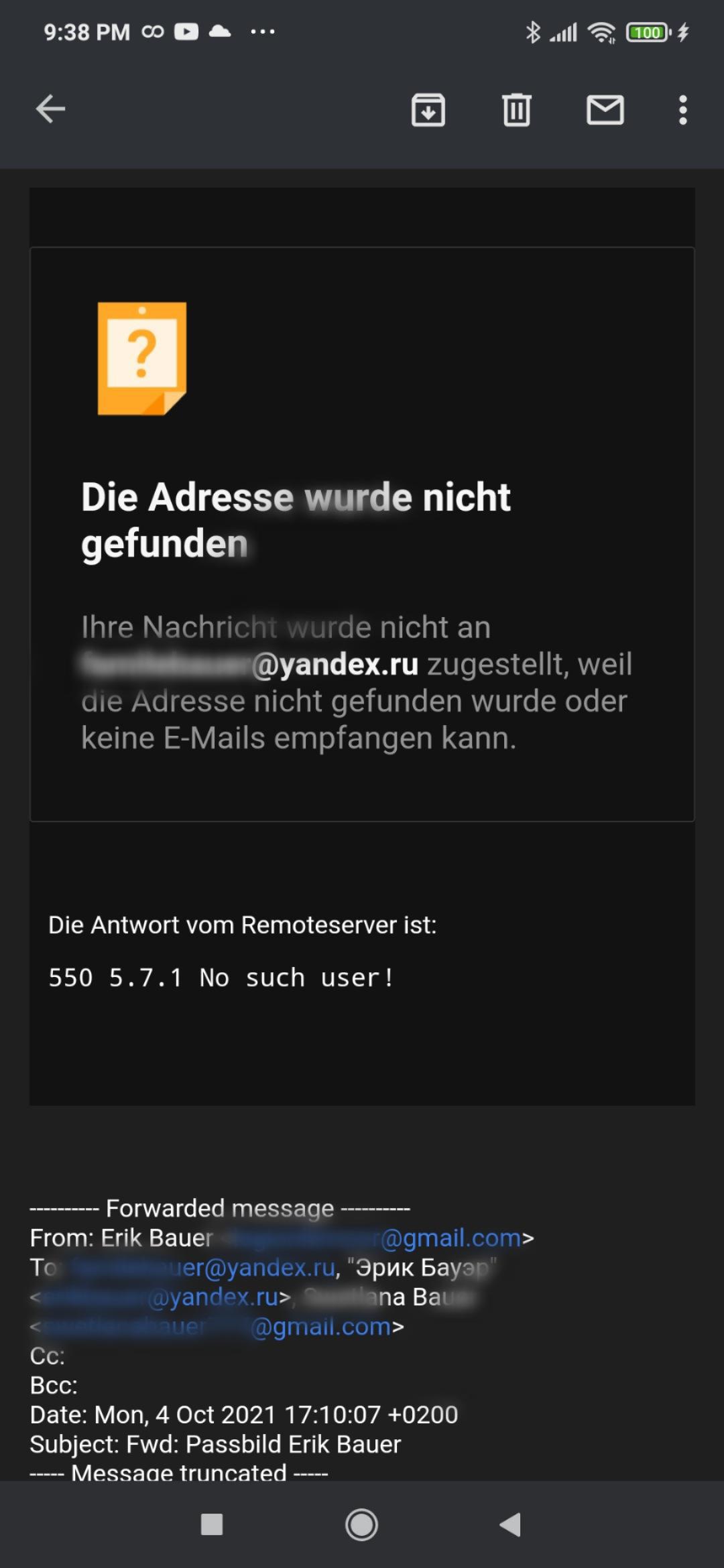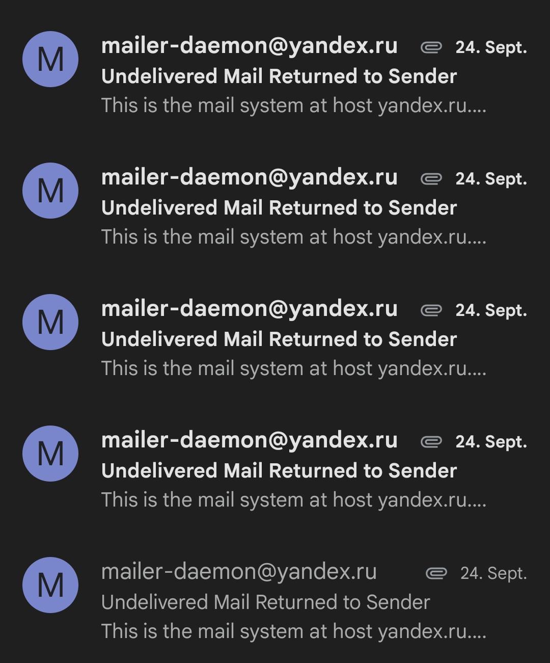 Я был не в курсе, как мне рассказали - там у Гугла с русскими медиа проблемы... И одна из грязных штук со сторон Гугла - блокирует адреса Яндекс. Ни с Яндекса что то отправить на Гугл нельзя.... Всякие отмазы мол там спам или опасность якобы... Что враньё, я ж свой адрес знаю, я не делаю там спам. Или с Гугла на Яндекс тоже - он заявляет что не нашел вообще... Якобы ..