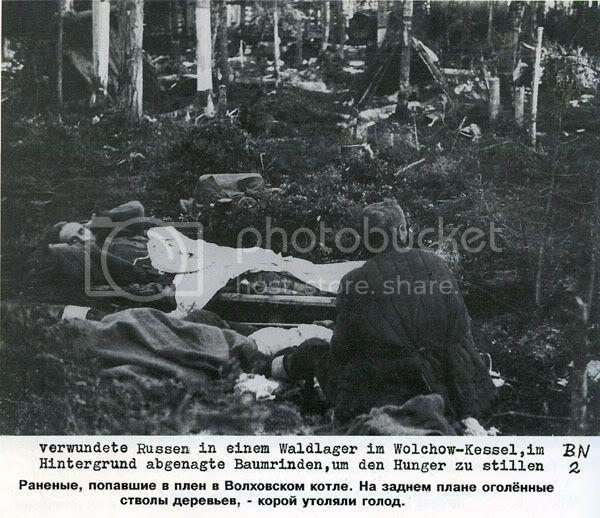 И фото в тему. Раненые как раз второй ударной. Видны деревья с которых объели кору. Не знаю, возможно это немецкий монтаж, но то что люди жутко голодали - факт
