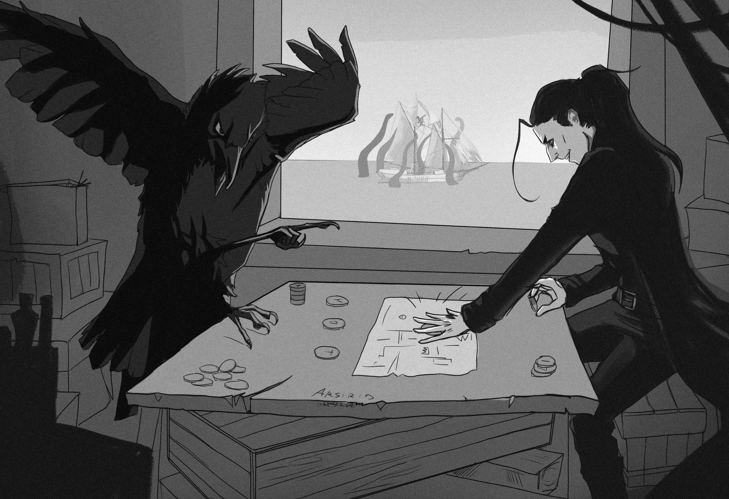 Непомерно азартный ворон Кар-Мин и жадный до приключений маг, с упоением рубятся в настолочки где-нибудь в неблагополучном квартале.