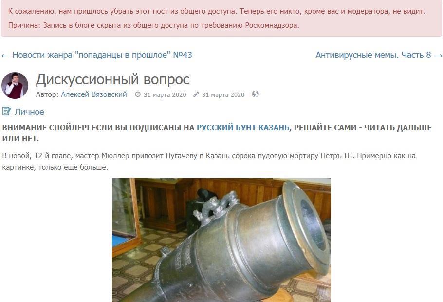 Автор: Алексей ВязовскийСпустя полтора года (!), Роскомнадзор решил, что мой пост про пушки и зажигательные смеси (обсуждали как Пугачеву штурмовать Нижний Новгород в серии Русский бунт) нарушает закон (¯\_(ツ)_/¯) и дал команду АТ выпилить его.