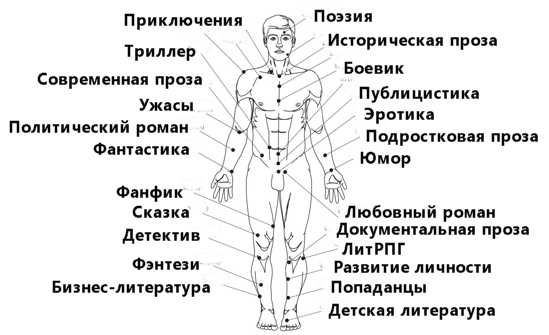На самом деле успех на литературном поприще зависит от воздействия на так называемые жанровые точки человеческого тела. Сейчас я приоткрою завесу тайны, сообщив, где названные точки располагаются и как на них правильно воздействовать.
