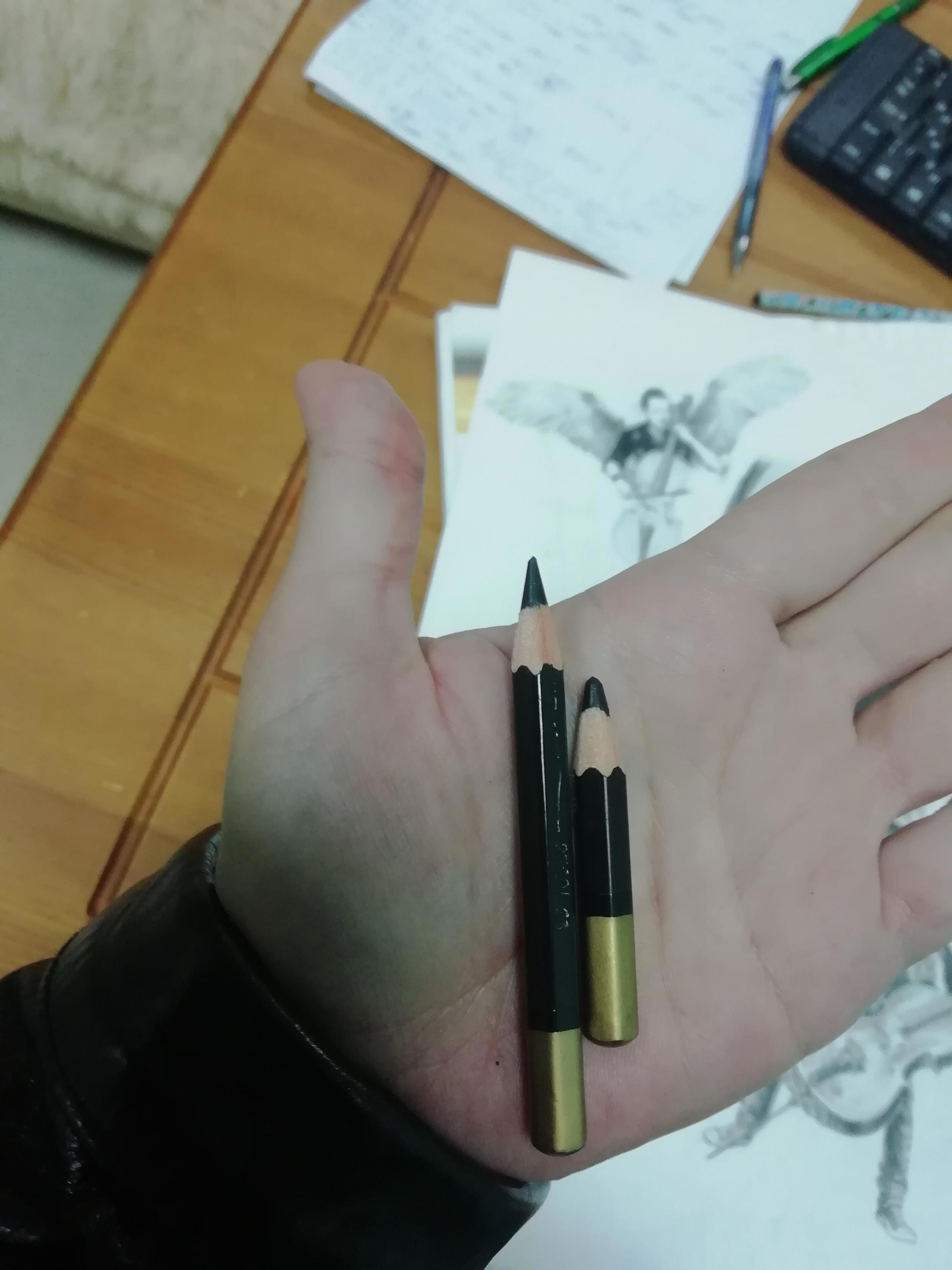 Ну, что же, дело оставалось за «малым»: лист формата А3 — и графическое черно-белое изображение на нём, как пожелала заказчица. Откуда во мне в последнее время появилась неприязнь к блеску, которой даёт традиционный графитный стержень — не знаю. Даже за подобную масштабную работу я взялась уже привычными мне акварельными чёрными карандашами, с их приятной матовостью и мягкостью. Из-за манеры стопицот раз поштриховать по одному и тому же месту именно остро отточенным кончиком, естественно, оба карандаша пали смертью упорных (кто сказал «упоротых»?))) Фото павших прилагается)
