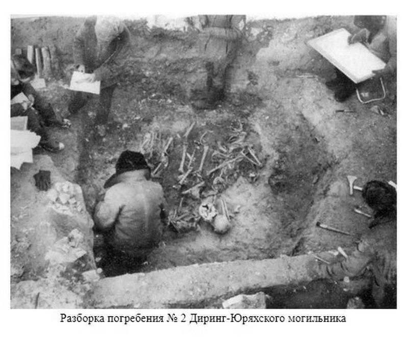 А тут ещё совсем недавно (в моей шкале), в 1982 году, в одном интересном месте со среднегодовой температурой -14 градусов по Цельсию наткнулись люди на одну интересную находку. Раскопки называются в честь речки Диринг-Юрях – притоке Лены. Это в Якутии, как раз на территории природного парка Ленские Столбы (61 градус северной широты). Ещё раз… это не в Африке, а совсем даже наоборот. Всё случилось благодаря геологам, которые в тот год решили собраться в Якутске. Из-за этого и копать начали. Но почти сразу наткнулись на кости. Оказалось, что это детское захоронение (ребёнку было около 9 лет). Датировали захоронение двумя тысячами лет до нэ. Такие встречаются нечасто, мягко говоря, а в тех краях так и вообще редкость, потому как в тех местах редко копают. Поэтому раскопки решили расширить и углубить. И дело пошло: