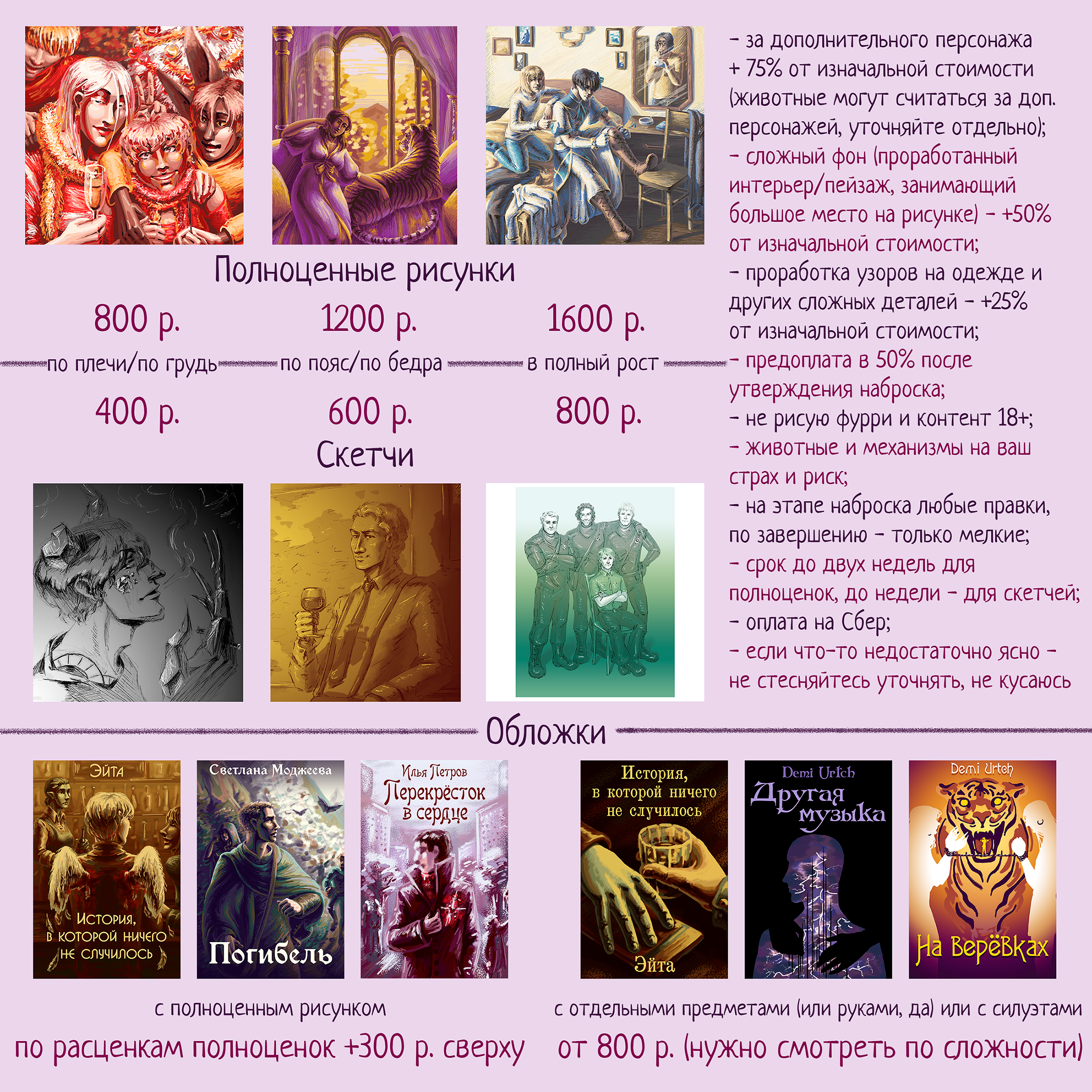 Прайс - от 6 тысяч за полноцвет обложку, от 300 руб за набросок\скетч\лайн