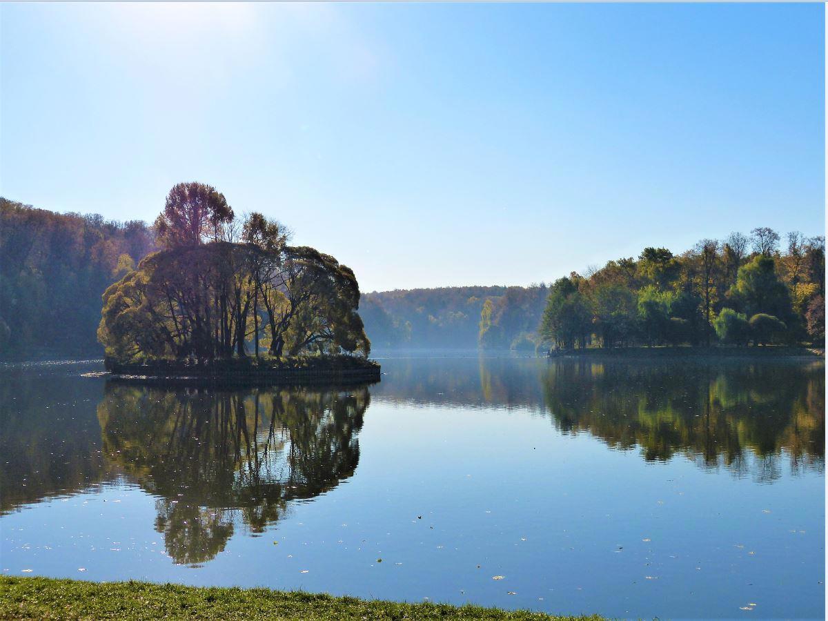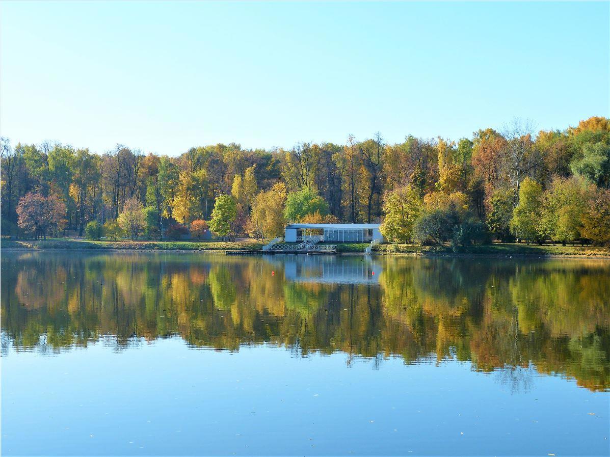 В спокойной воде Верхнего Царицынского пруда отражалась разноцветье парковой рощи.
