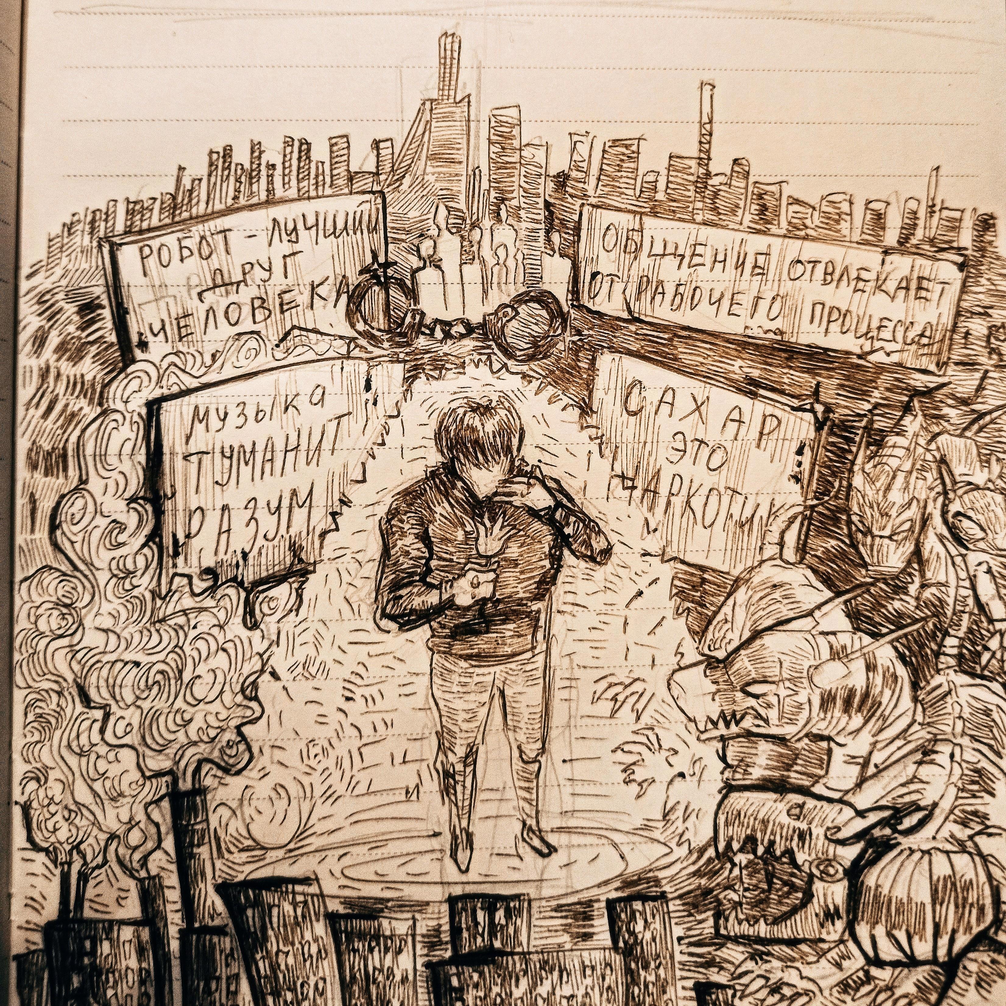 Сегодня я за городом, так что отрисовала тему не на компе, как обычно, а в блокноте.