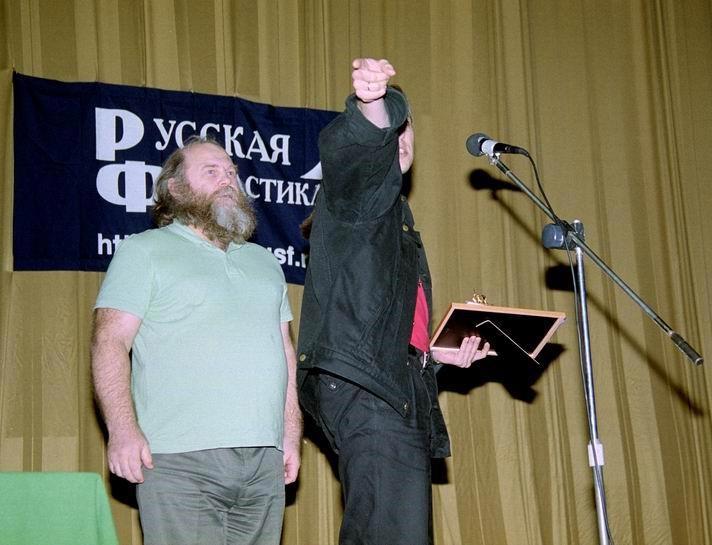На картинке для привлечения внимания: матёрый мэтр Логинов (52) вручил мне, молодому (34) "Золотой Роскон", а я показал Русской Фантастике, куда ей идти.