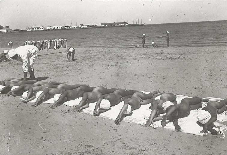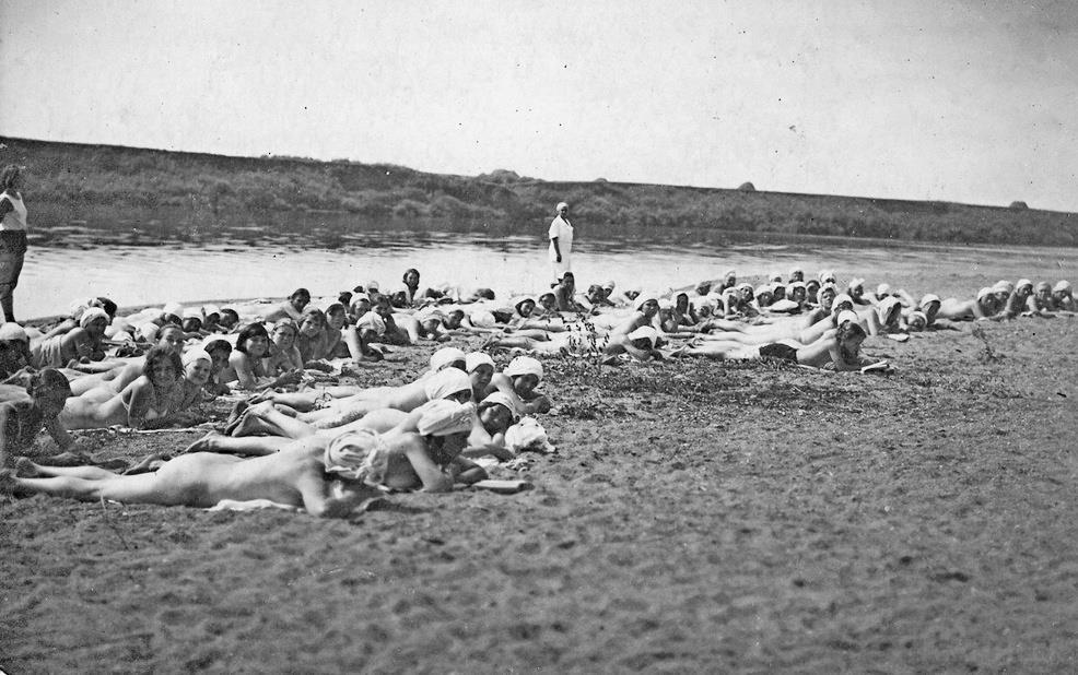 И в детских лагерях, тех же пионерских - это делалось тоже. Злые большевики беспощадно жарили бедных детей под палящим солнцем. Учитывая, что рахит в то время был бичом настоящим - тут уж польза была наглядной. Медсестра смотрит, чтоб прожаривались равномерно. (вообще-то содрогаюсь внутренне - это ж какая дисциплина, что такие мелкие охламоны лежат неподвижно аж по несколько минут!) Вот к слову - непонятно - часть детишек страдает лежа, а несколько проходимцев шляются по песочку и у воды.
