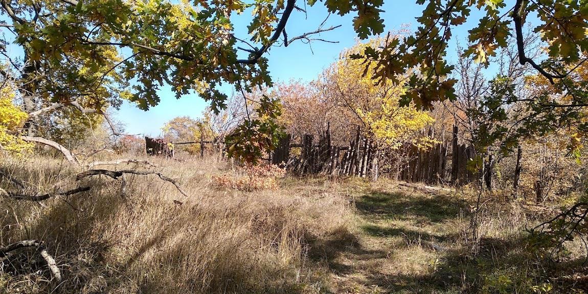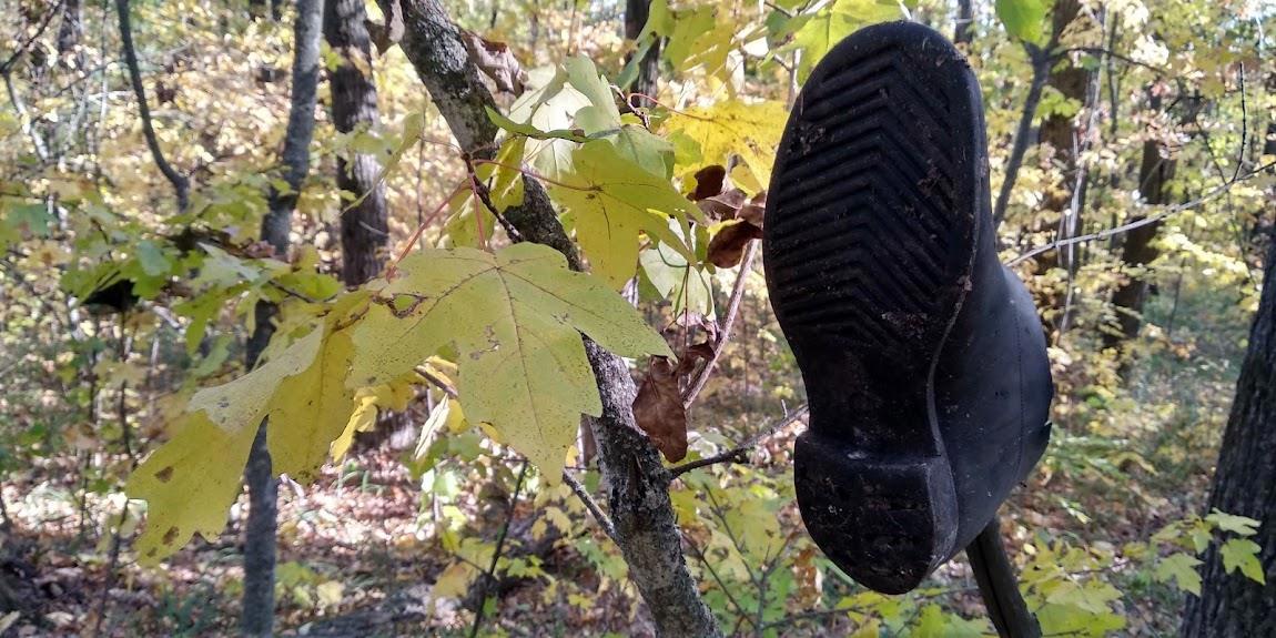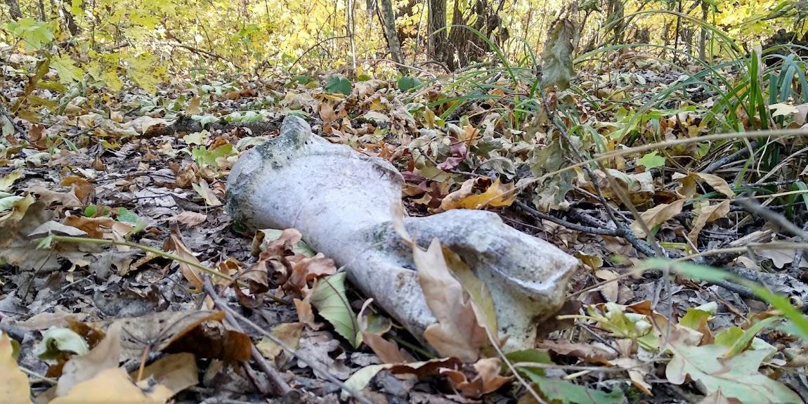 В желтых листьях валяется обглоданная кость какого-то крупного парнокопытного, а на ветках висят чьи-то калоши.