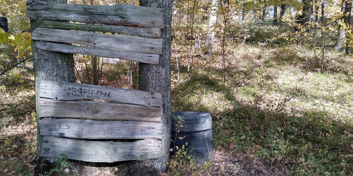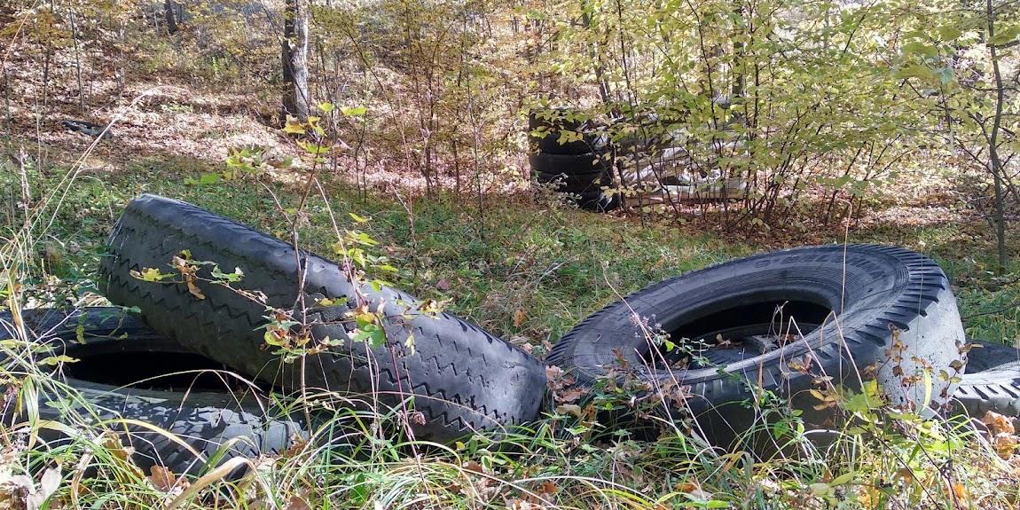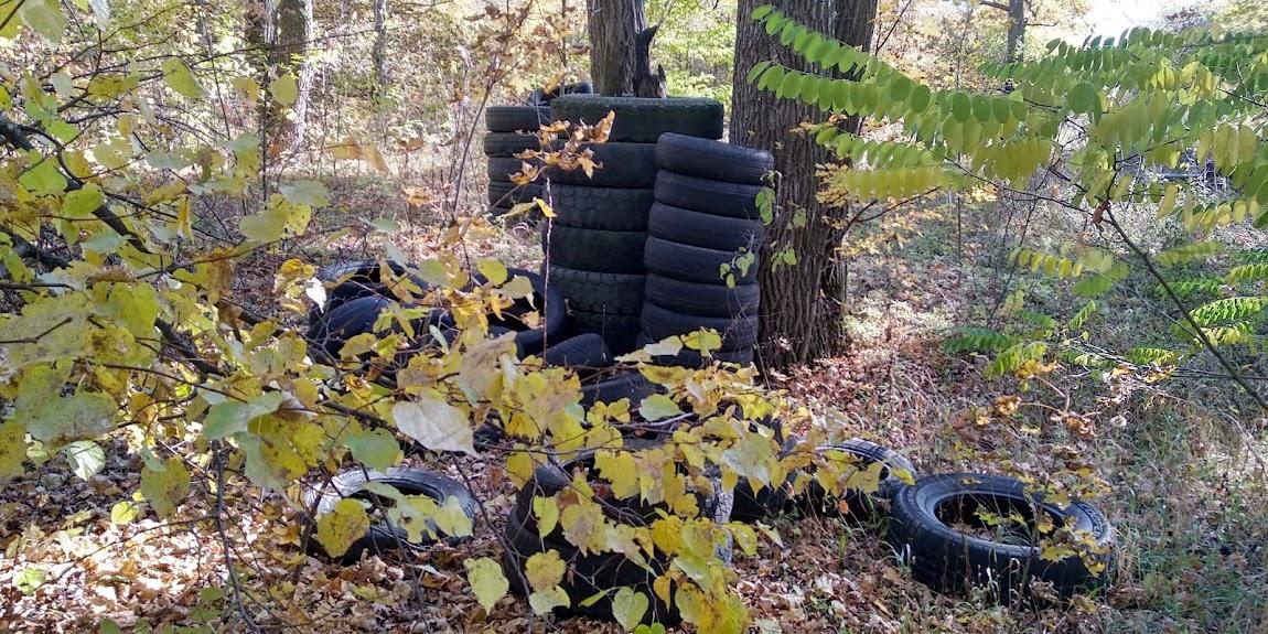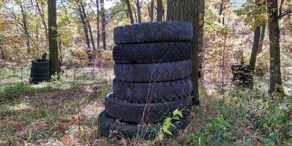 В одном месте все завалено автомобильными покрышками. Некоторые из них насажены на обрубки деревьев, как на кол и напоминают загадочные черные существа или тотемы неизвестного племени.