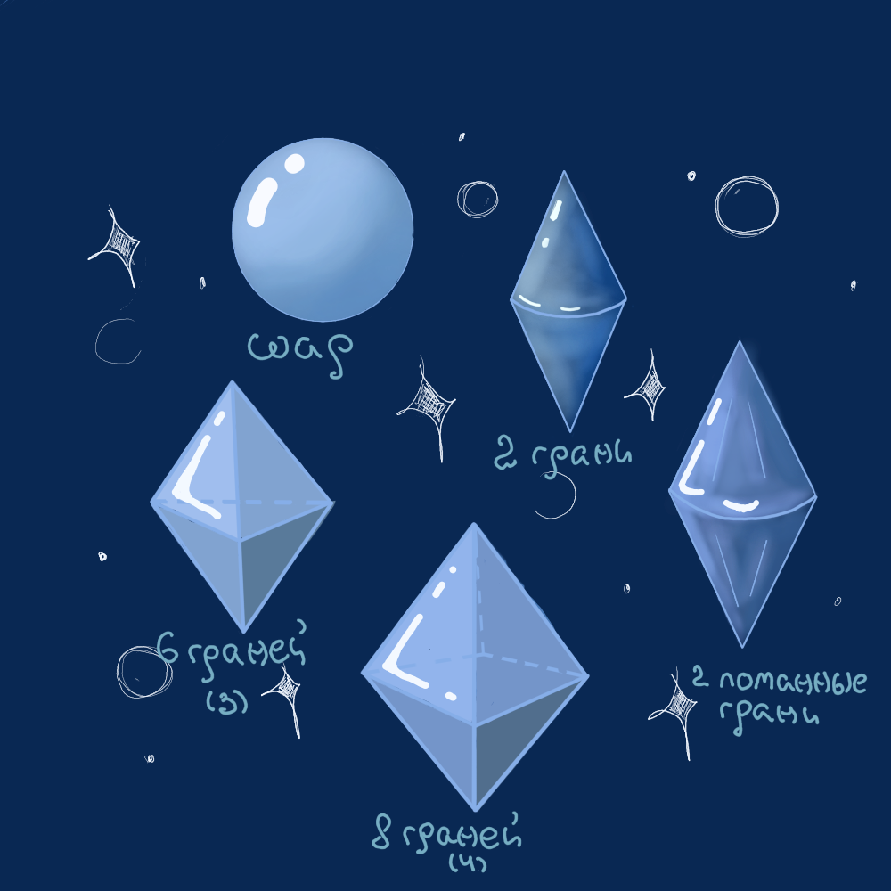 В моих мирах всего 5 видов душ. От вида зависит то, сколько душа сможет впитать, сохранить и передать силы своему хозяину. Сила впитывается через ребра многогранника, а отдается через 2 самые узкие вершины. В основном душа впитывает свет, однако при темных трещинах начинает впитывать и тьму, пускай и в малых количествах.