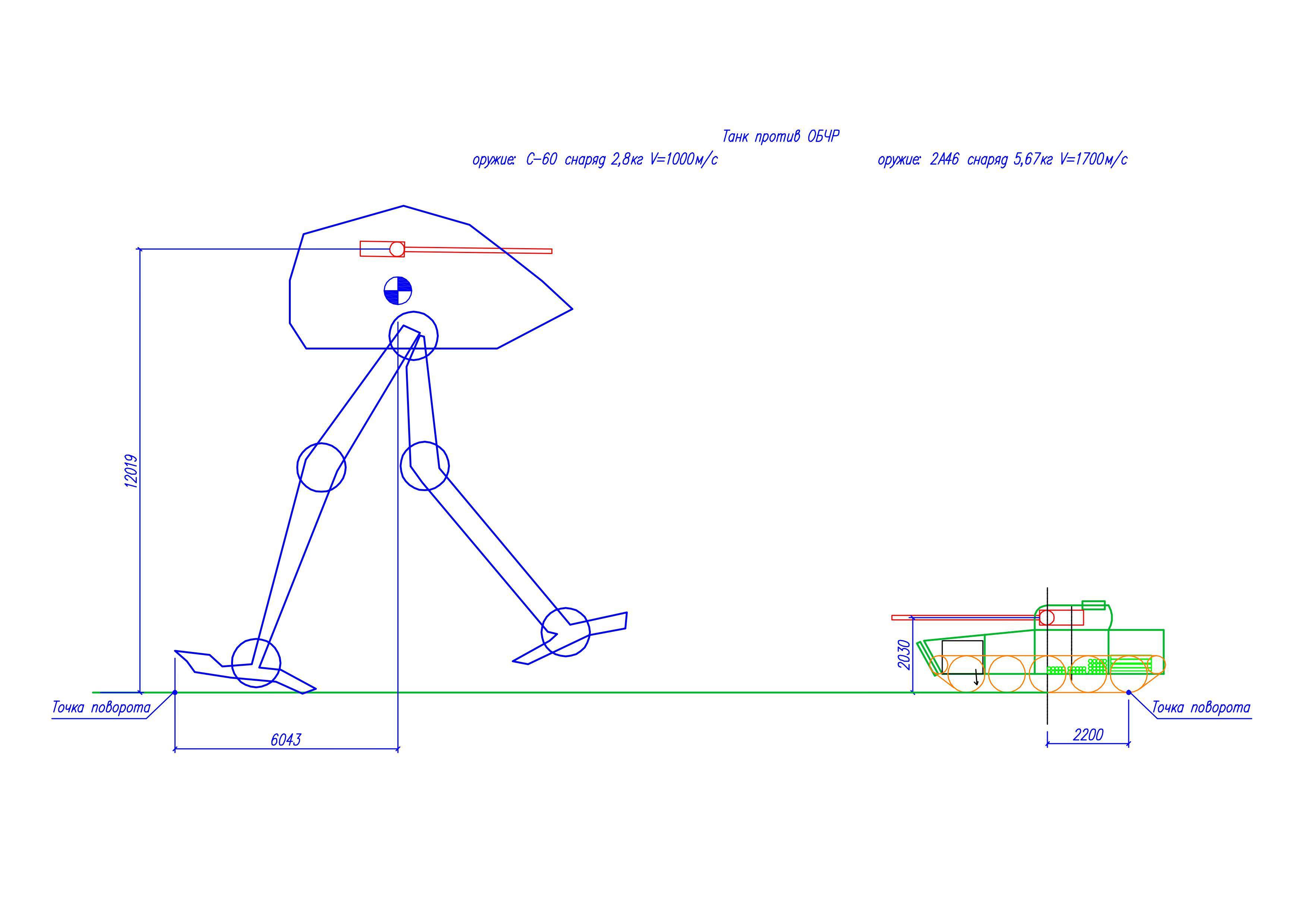 Ну, про стрелковую стойку для робота высотой 12м я уже говорить не буду. Просто посмотрите на третьей картинке сравнительные величины плечей приложения нагрузки для танка (2,03м) и робота (12м) - один и тот же снаряд чисто на геометрии толкнет робота в шесть раз сильнее.