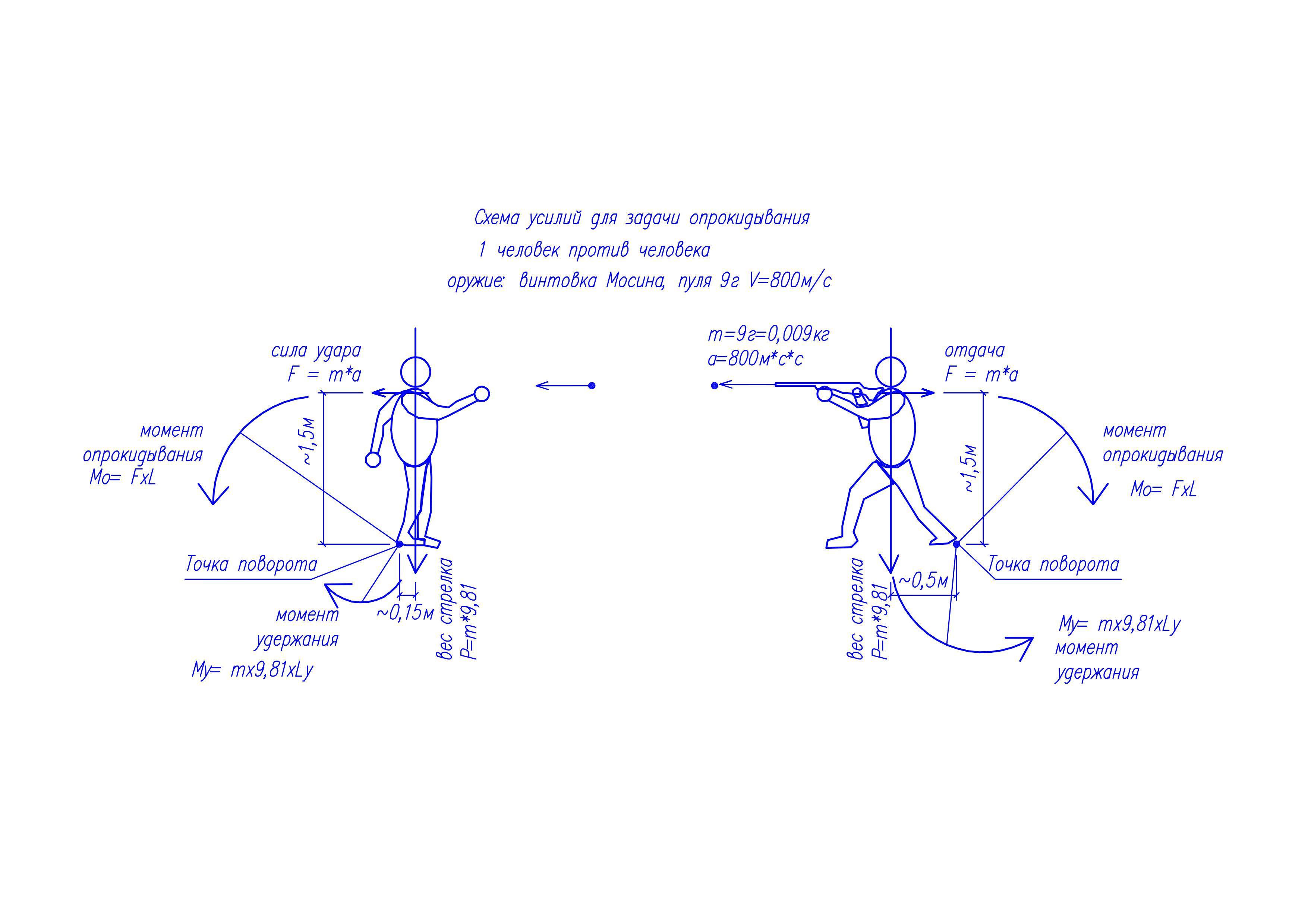 В первой схеме показаны два человека. Правый стреляет. Сила отдачи приложена на высоте 1,5м от условной точки поворота. За счет правильной позы, его опорное плечо - между центром тяжести и точкой поворота - равно 0,5м. Вес пули 0,009кг, вес стрелка со всеми причиндалами 100кг, чисто для удобства подсчетов. На второй картинке, где таблица, видно, что его запас устойчивости : 2,7 (первая колонка в самом низу).