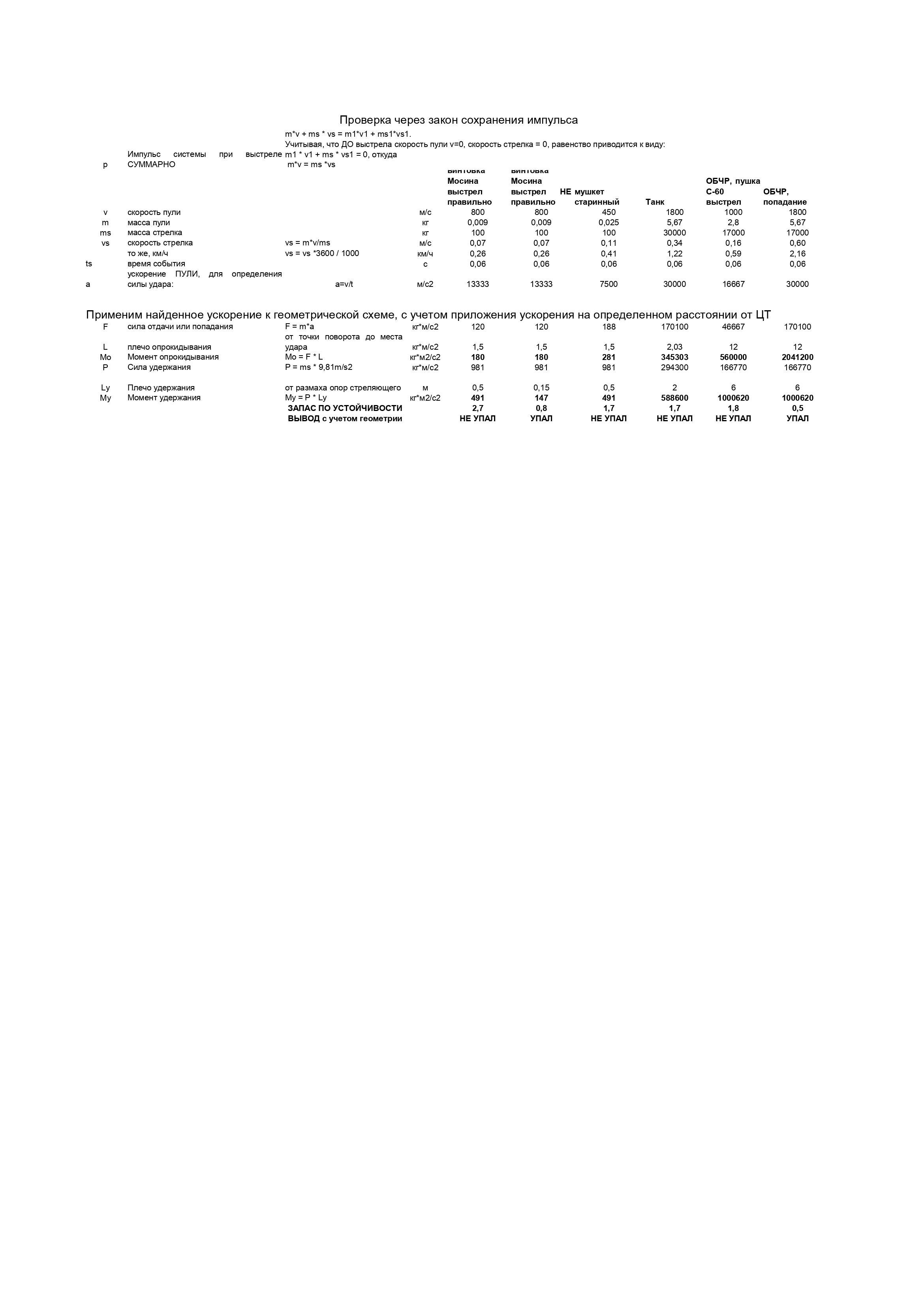 Если же стрелок будет стрелять, сдвинув ноги (плечо опирания примерно половина сапога, 0,15м) - то отдача его опрокинет. Это соседняя колонка, запас устойчивости 0,8.