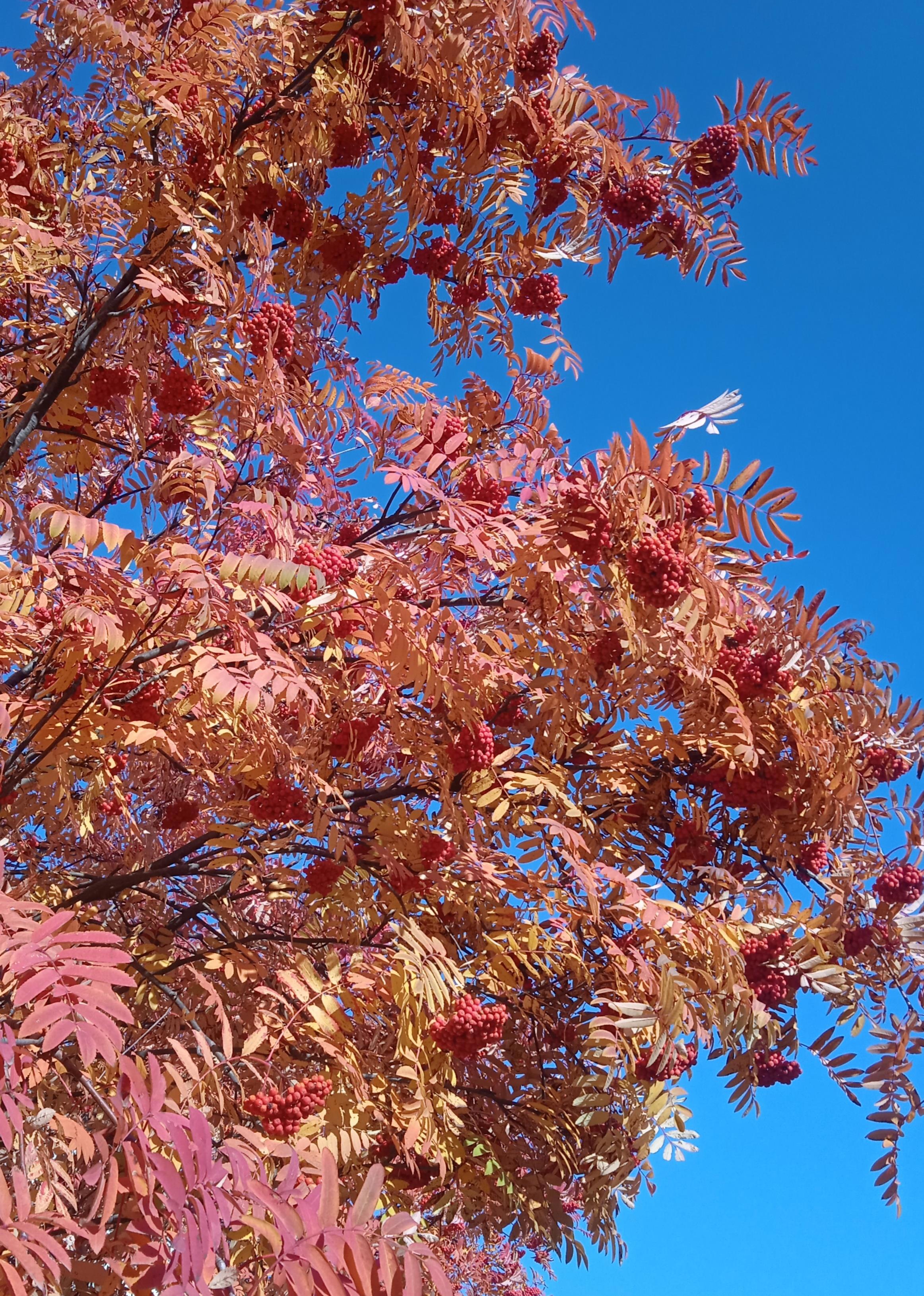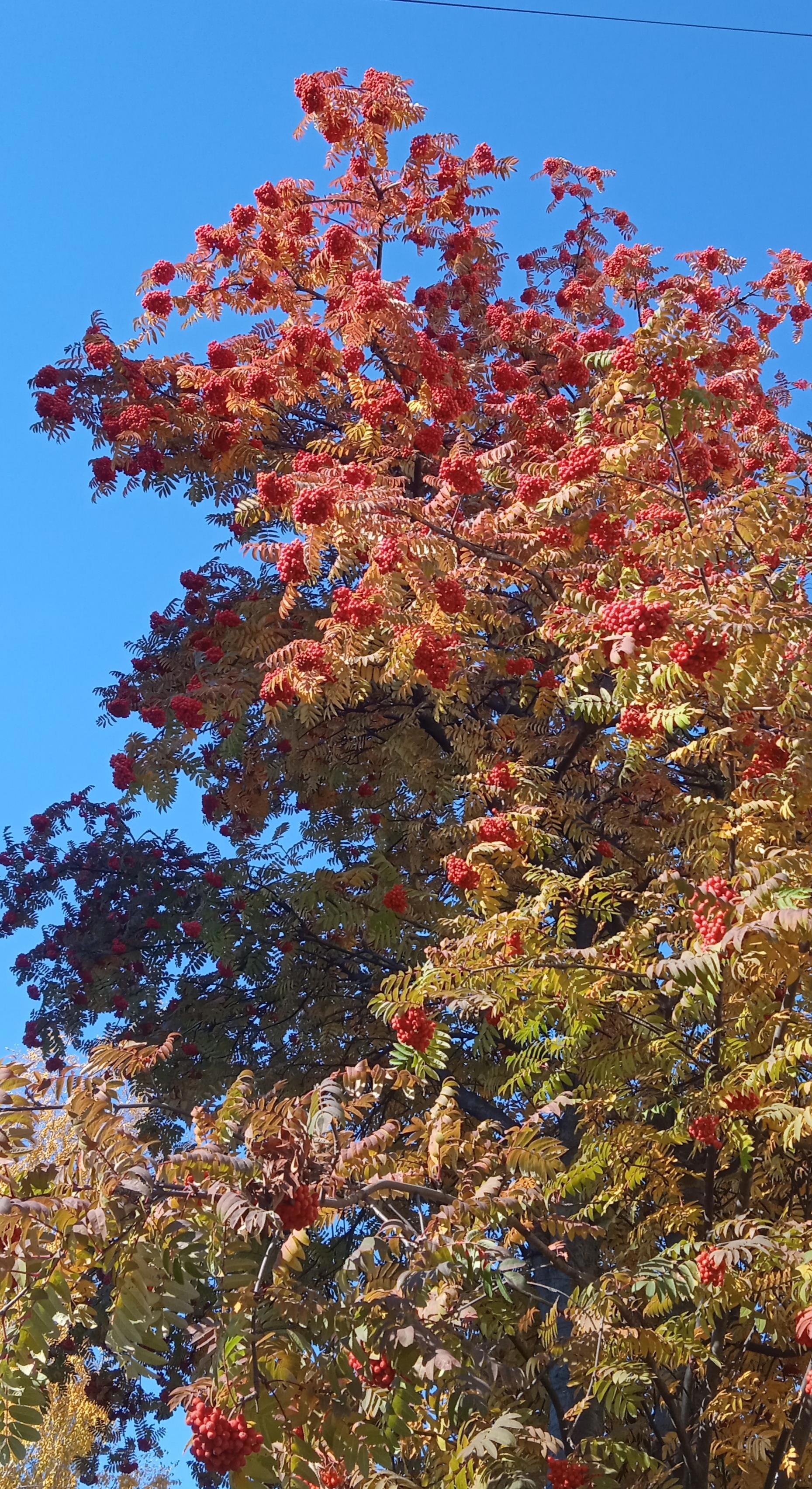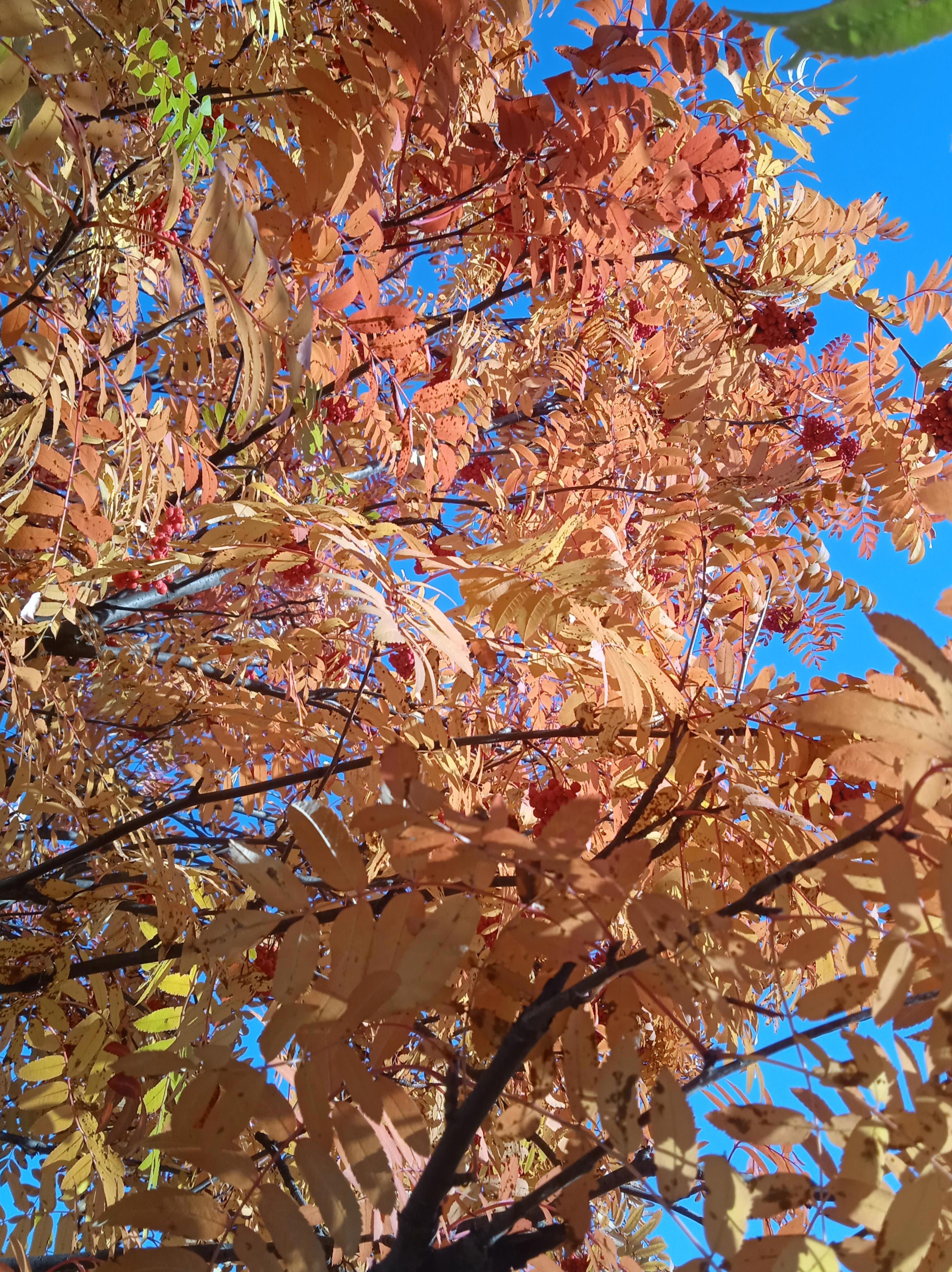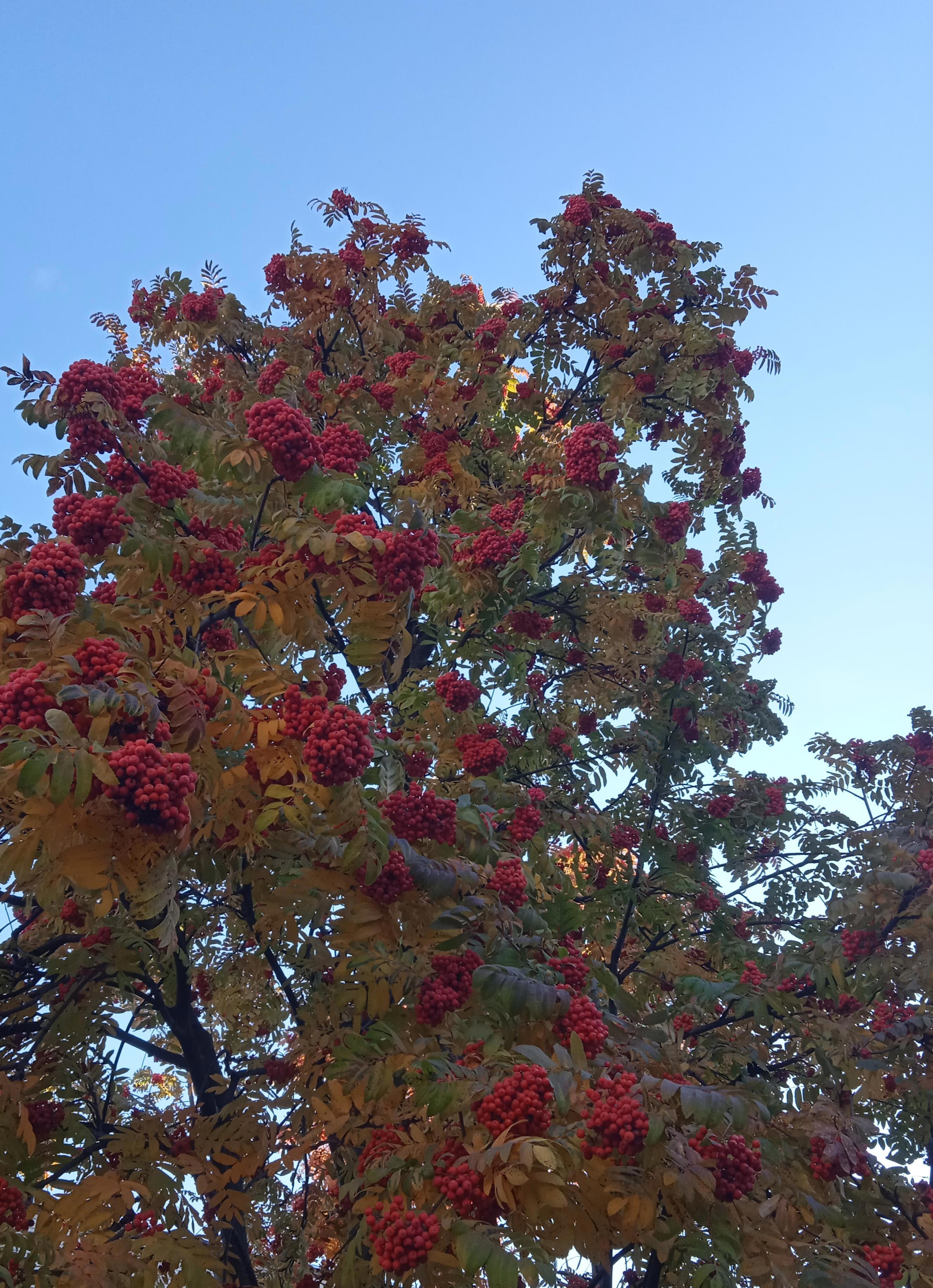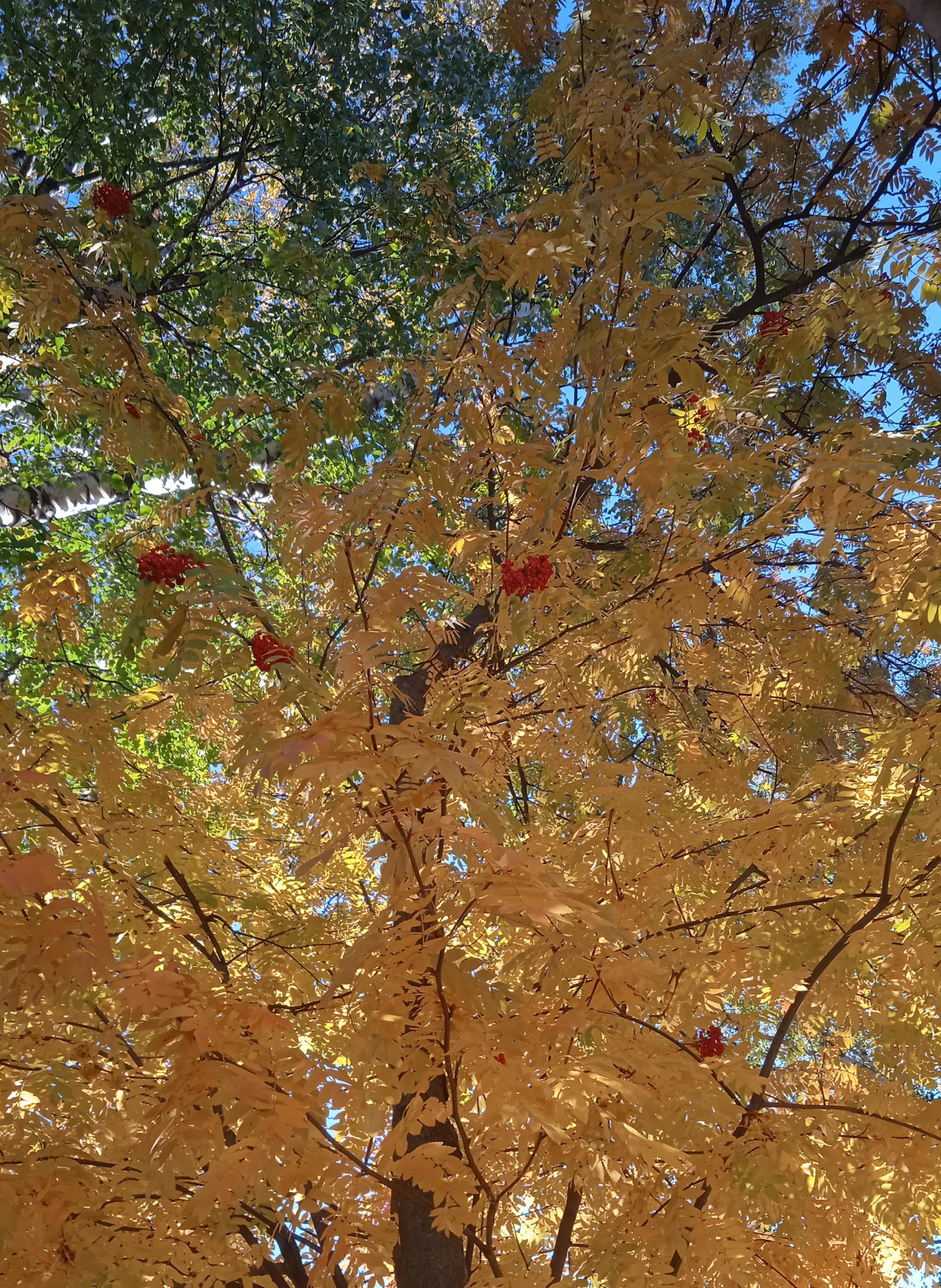 Но особенно много этой осенью рябины красной. Да и листва этого дерева радует разными оттенками:
