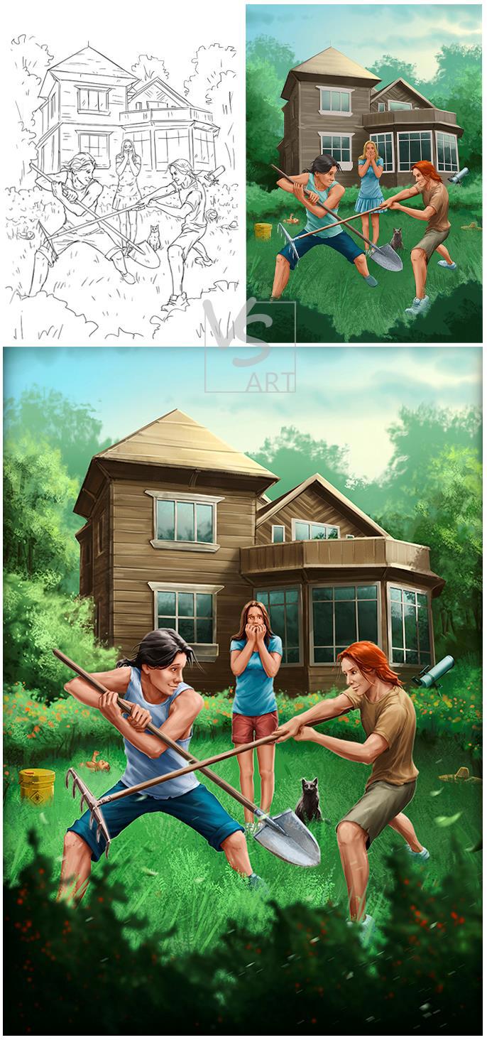 Автор: Салихов Василь"Долгий солнечный день" - так называется новая книга Екатерины Белецкой, для которой была создана эта обложка. В целом сцена не простая в силу композиции, определенной динамики и цветовой гаммы. Хотелось привлечь внимание ко всем планам и некоторым деталям (пасхалкам), которые имеют важное значение для читателей и автора. Движения героев взяты с оригинальных референсов, все остальное чистая выдумка.)