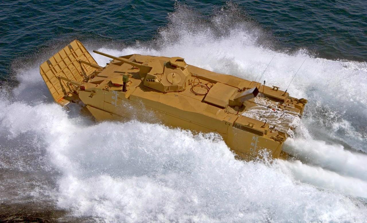 Понятно, что в этот момент её лучше всё же рассматривать именно, как судно. Американцы подошли к делу со всей ответственностью – даже нанесли на бортах носовую и кормовую линейку осадок. Вполне достойная высота надводного борта. Нет, дело не в том, что вода попадёт внутрь, а в том, что борт важен для обеспечения остойчивости. То есть, пока она стоит или тихонько плывёт, то всё о’кей. Но это хорошо получалось и у старых машин типа LVTP7A1. Вот они плывут: