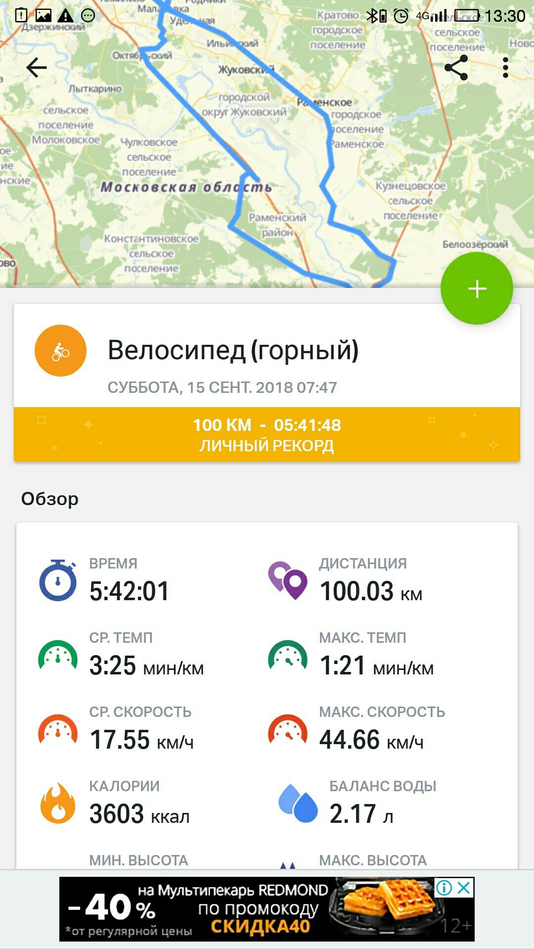Но вот всю вторую половину дороги, яндекс мне приготовил жёсткую. Сплошная пересечёнка, с разной степенью одурения. Тут и дорожная насыпь из строительного перемолотого мусора, что-то вроде перемолотого гипса с кирпичами, и агропром, с разбитой грузовиками асфальтовой дорогой на протяжение пяти километров отбивающей пятую точку, а дальше вдоль рельс, по паркам и тропинкам, через протоки и тоннели, сосновые посадки и длинные улочки частного сектора. Доехал я обратно до Малаховки, когда мне оставалось проехать ещё с десяток км. И последние десять дались мне... нет, не трудно. Конечно, сидалище выло, но тут ничего смертельного. Но каждый км воспринимался за два, каждые пять, за десять... Это были такие бесконечные пол часа жизни, большую часть которых, я ехал и грустно вздыхал, «Ну когда же, когда же...». И вот она, сотня. Отжимаю тормоза, прислушиваюсь к телу. А тело то, в целом, не так уж и устало. И это странно и в то же время приятно, хотя и присутствует чувство некой халтуры с моей стороны, где-то я не дожал... Дома провёл восстановительную йогу из NTC и... Вот что замечу, башка начала соображать только к вечеру, поэтому и пишу сейчас. До этого простейшие слова из головы вылетали, а формулировать нормальные предложения мог с заметными паузами. В общем, ничего не реального. Всем спорт, спишемся!