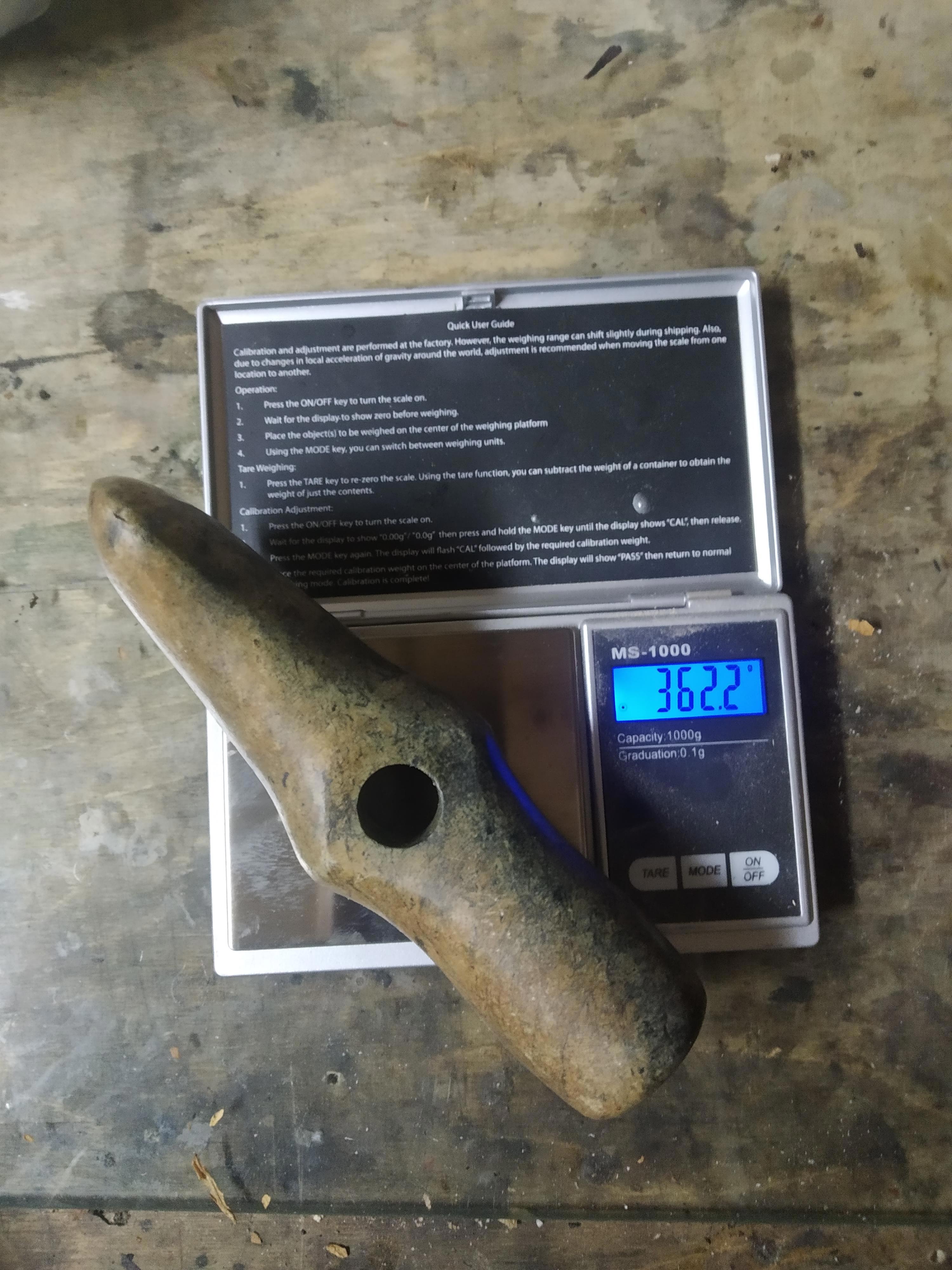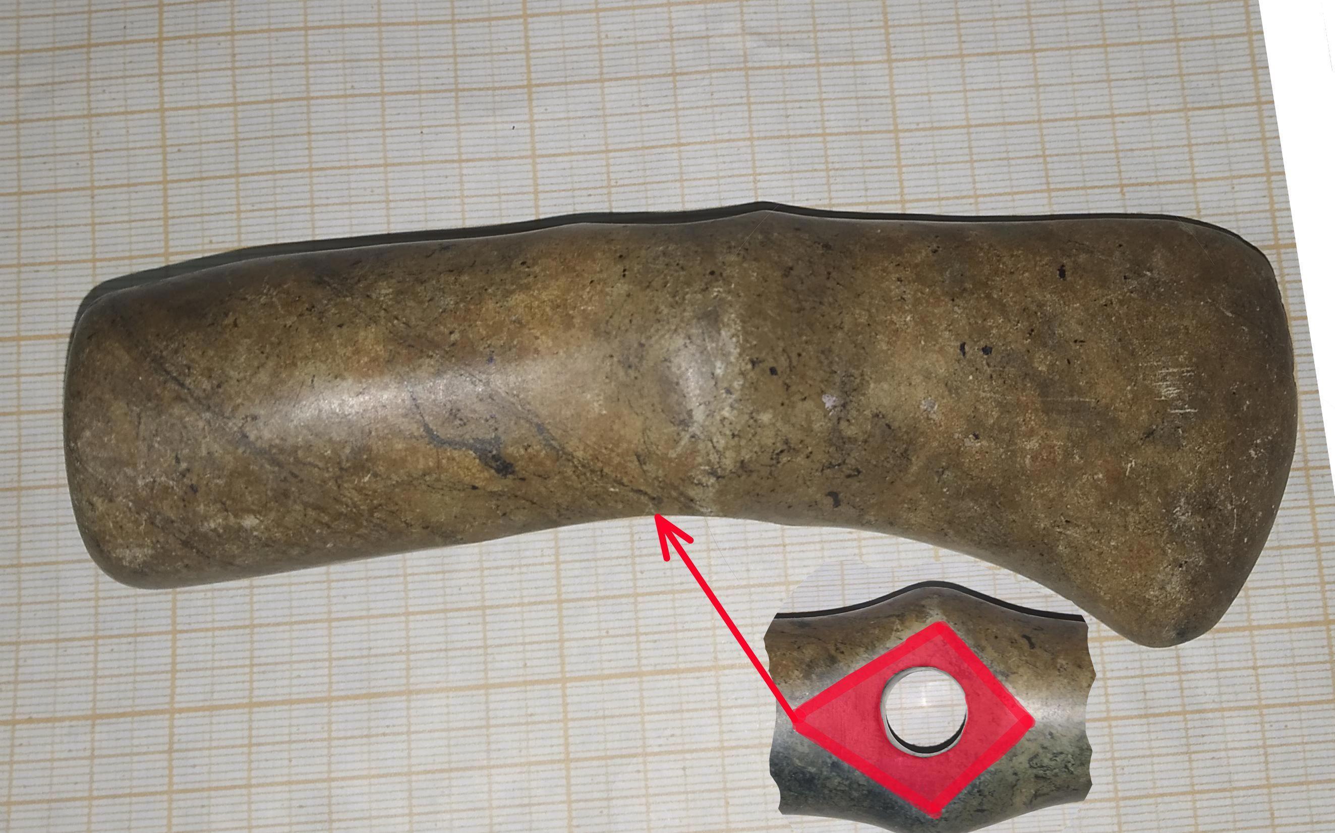 И вот — первая находка: с нижней стороны у отверстия имеется ромбическая площадка, с плоскостью, перпендикулярной оси топорища, при том, что с верхней стороны ничего подобного нет. Причем — у обоих топориков, хотя они отличаются размерами и пропорциями. Это ж-ж-ж — не просто так! Явно посадочная площадка. И вот размеры эти площадки имеют вполне вменяемые 35 — 40 мм (примерно).