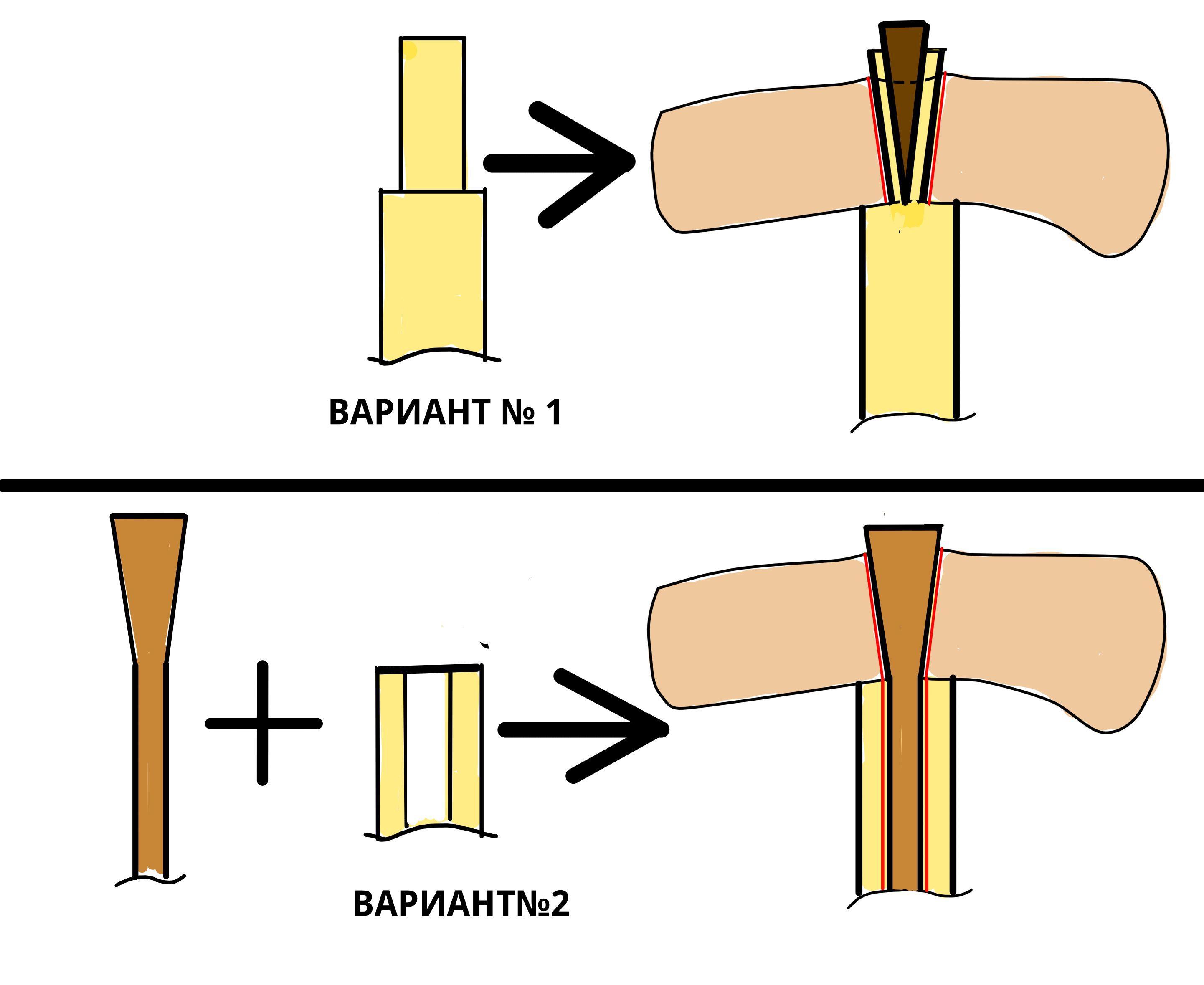 То есть — основная часть топорища была гораздо толще посадочного отверстия. Такое возможно в двух случаях: либо на топорище стачивалось посадочное место на цилиндр 15 мм, либо... Вот так:
