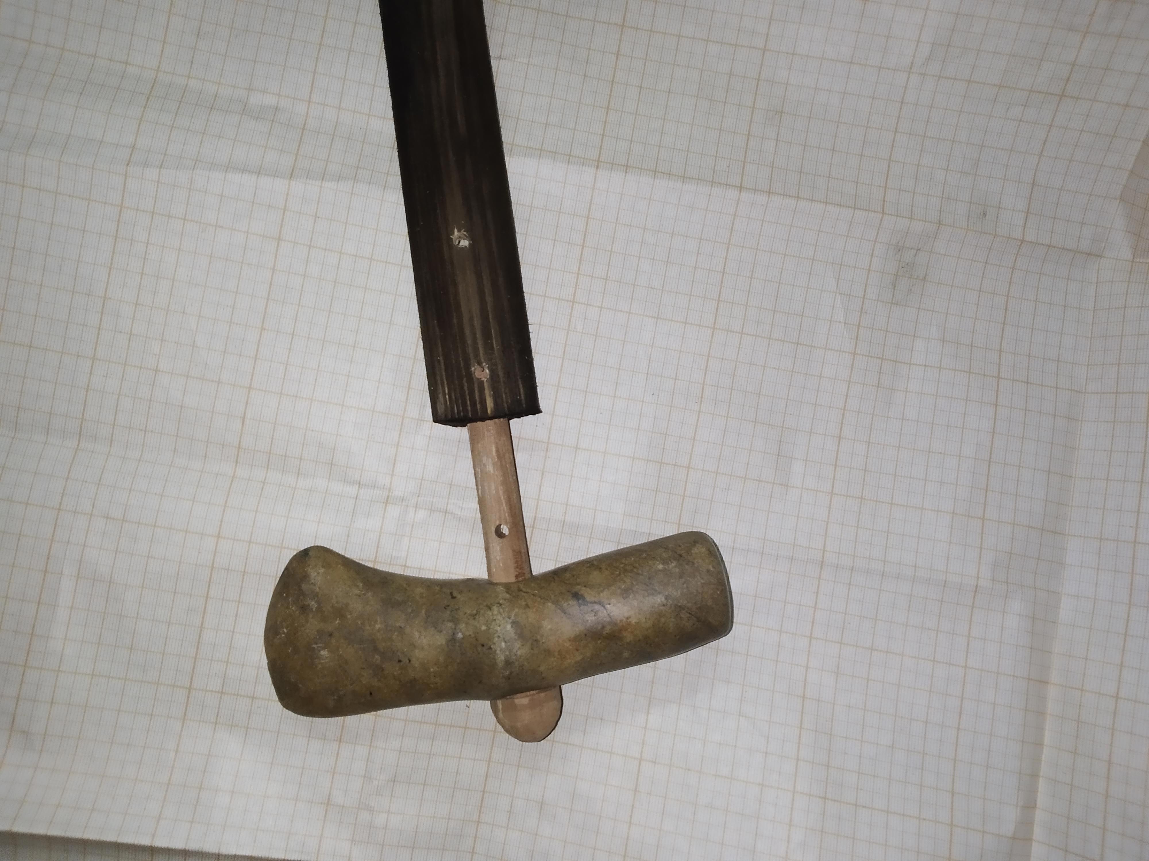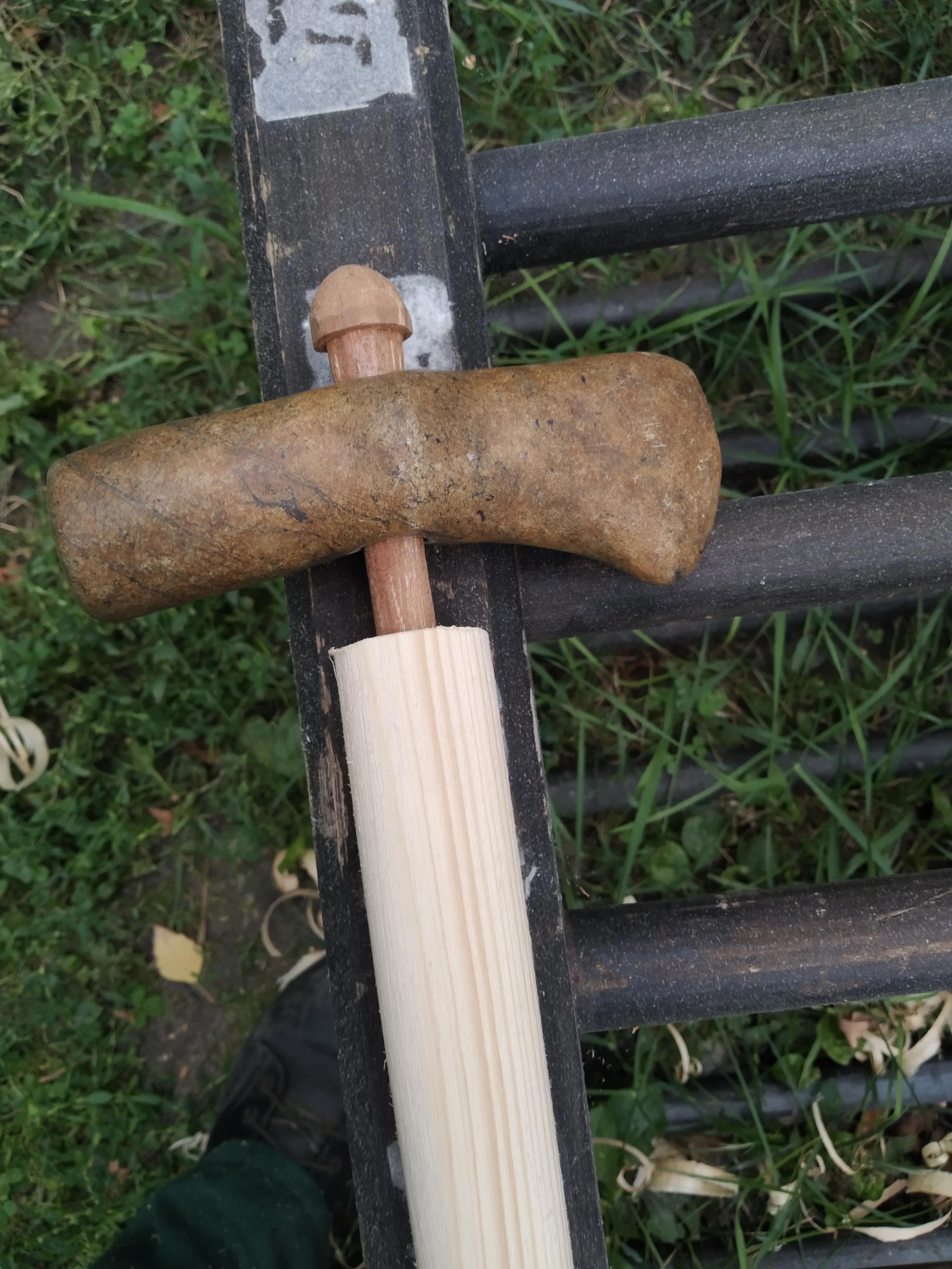 Ну а дальше были эксперименты. В первую очередь проверил маловероятный, на мой взгляд, вариант с стачиванием на цилиндр, насадил реплику, расклинил и опробовал. Как и говорила интуиция — крепление оказалось очень слабым, мало того, что посадочное место тонкое, так еще и расколотое. Выдержало это творение ровно два удара по сосновой доске. После этого стал развивать и дорабатывать второй вариант.
