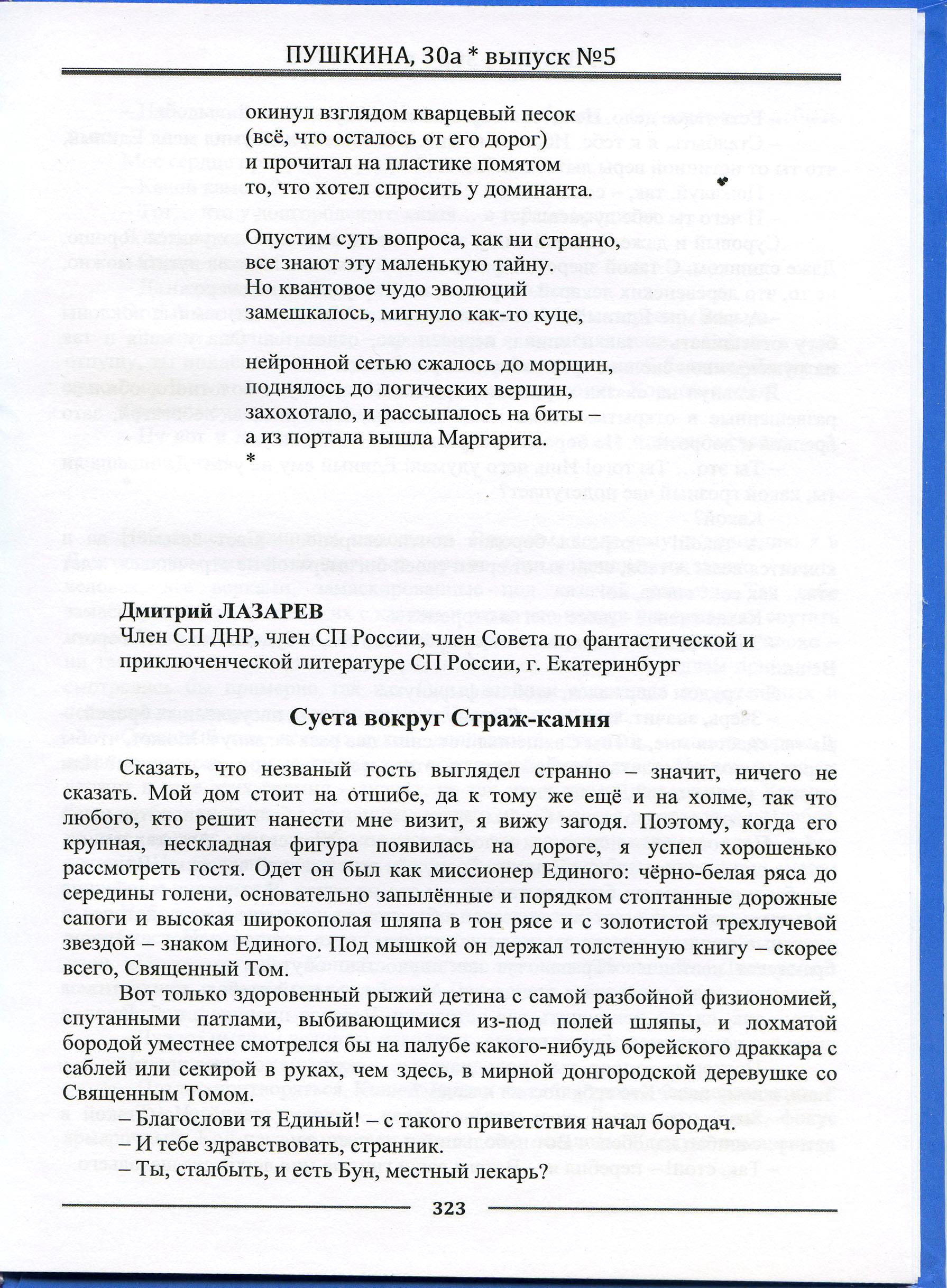 Автор: Лазарев ДмитрийЭтой осенью в Донецке вышел сборник-альманах союза писателей ДНР «Пушкина 30а», в который наряду с другими интересными авторами вошел и я с рассказом «Суета вокруг Страж-камня».Сам рассказ выложен здесь, на сайте. Прошу заглядывать на огонек.