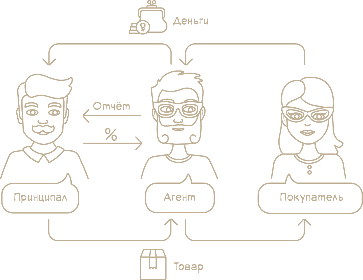 Мы решили пойти по более простому пути и не накладывать на себя обязанности налогового агента. И это никак не нарушает закон. В данном случае АТ является агентом, который принимает оплату со стороны покупателя и передает её автору (принципалу), удерживая часть суммы в виде комиссии. Картинка из интернета, для наглядности: