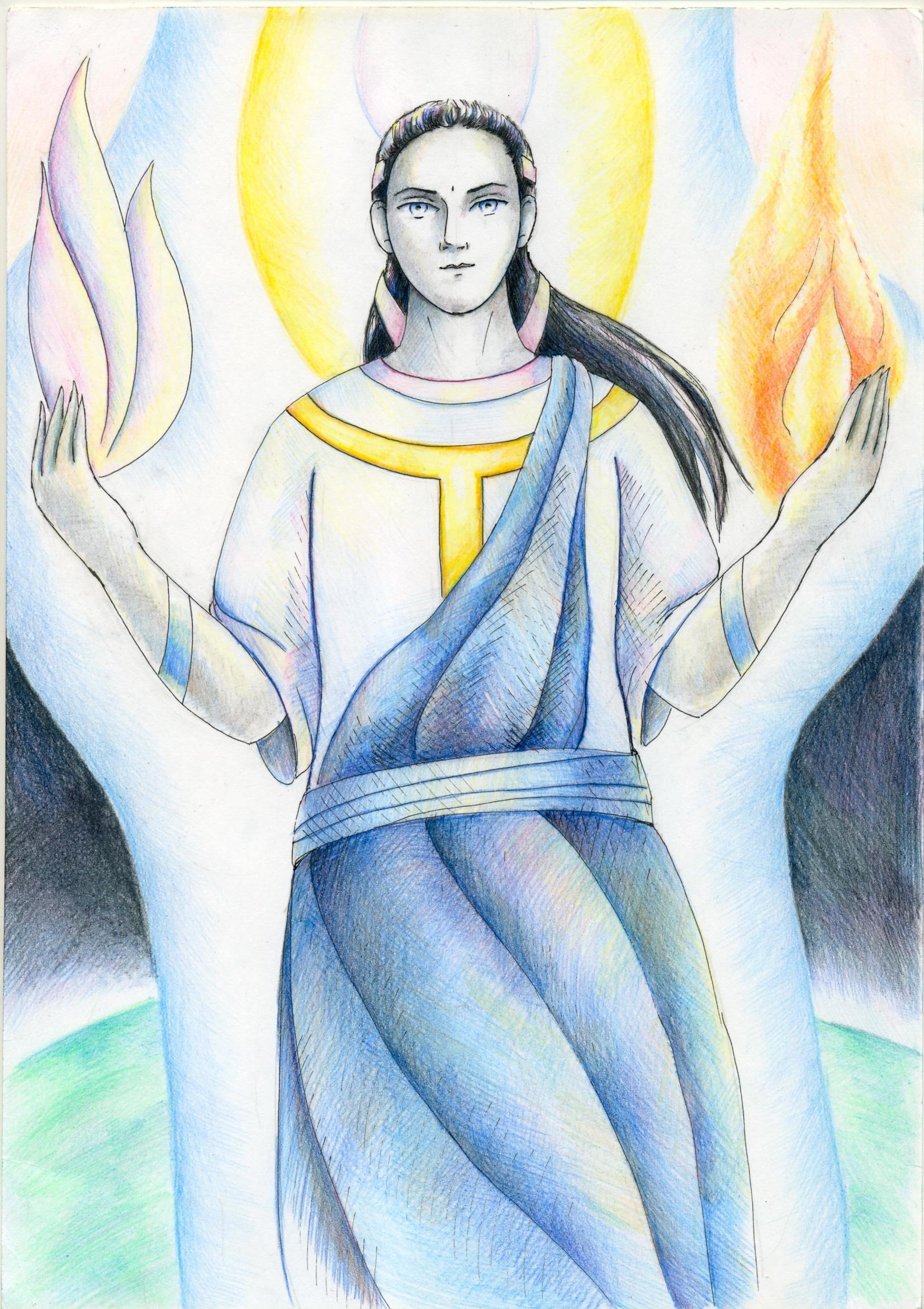 Возглавит список Гаэ Онсарра. Кому, как не ей, Праматери асайев, всегда быть впереди? Здесь она изображена как асайское божество с символами сверхсуществ Ганагура (фиолетовое соцветие) и Салангура (пламя) в руках, поднявшаяся над твердыней в космическое пространство.