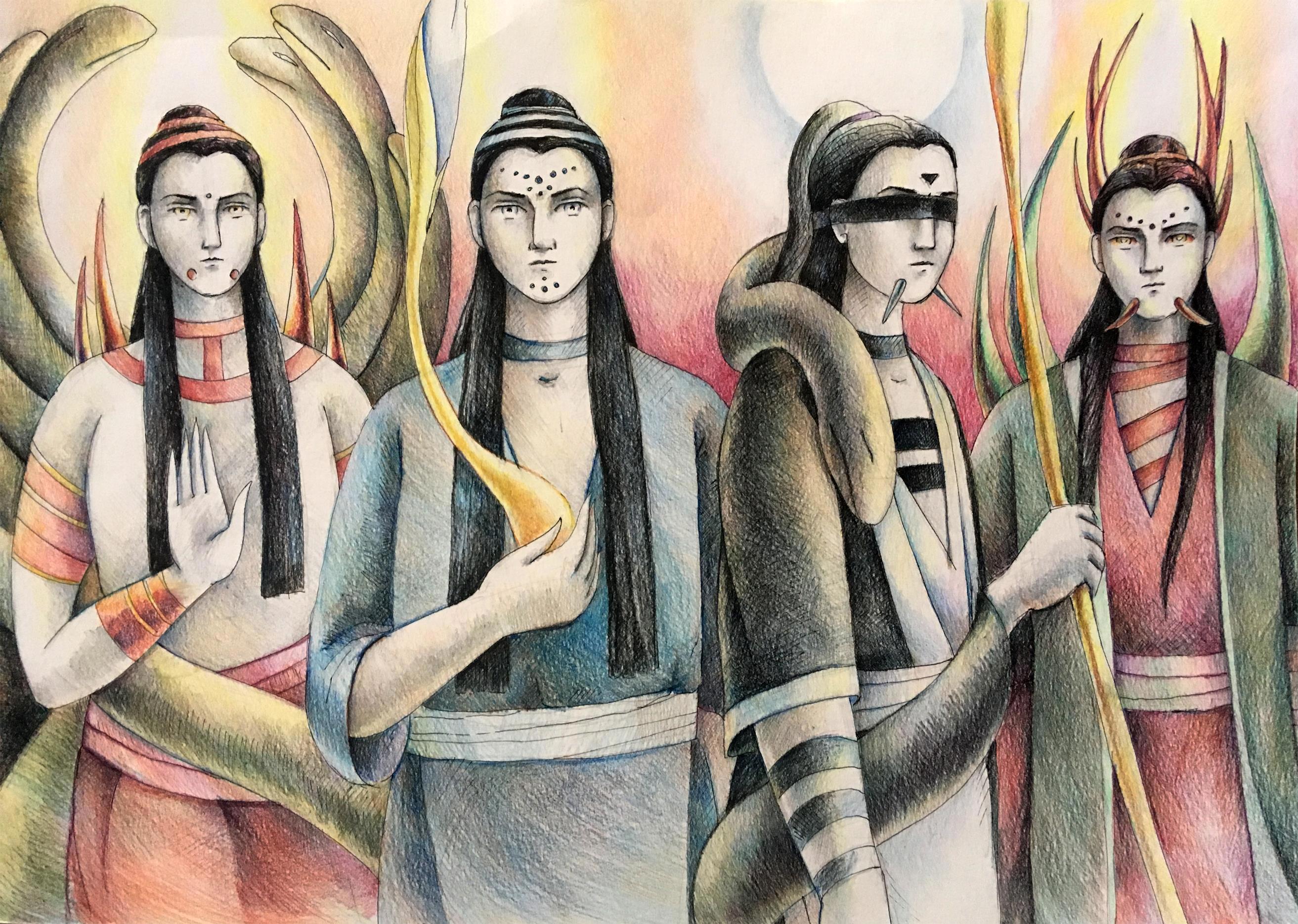 Ну и третьими пусть будут нэны, госпожи недр. Нэны активно обустраиваются в третьей книге цикла, так что обойти вниманием их нельзя. Кроме того с этой иллюстрацией связаны мои воспоминания о путешествии на поезде Владивосток-Москва. Правда весь Транссиб преодолеть не удалось, выходить пришлось за Уралом. Пять дней в пути – четыре нэны. Слева направо – госпожа Аминда, госпожа Доната, нэтци Унадини Фекдис, и нэна-горнячка.
