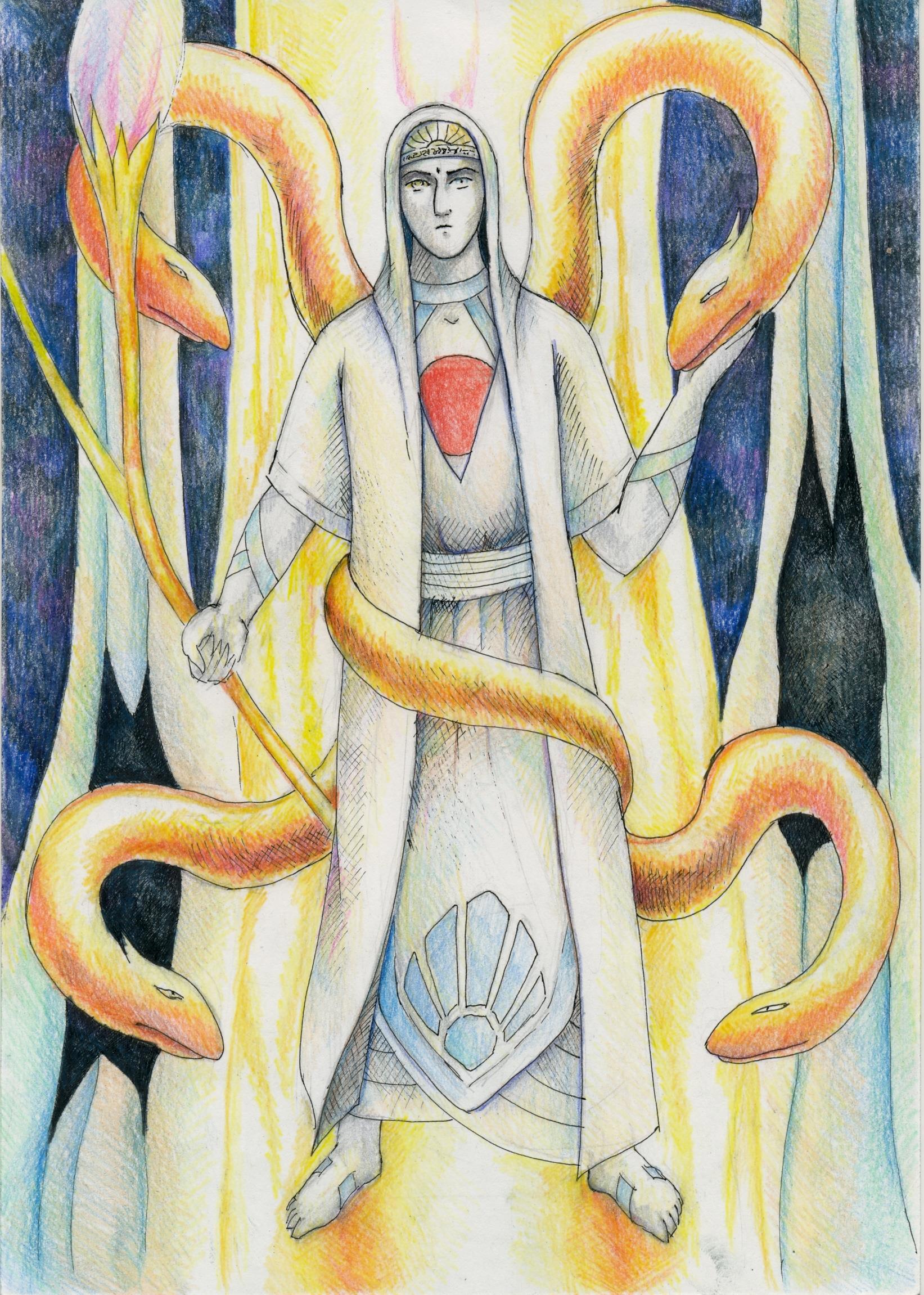 Второй в списке – мастер Саргон с четырёхглавым золотым змеем. Мне нравится сочетание цветов на этом рисунке. Мастер Саргон в потоке волн вырывается из долгого заточения в недрах.