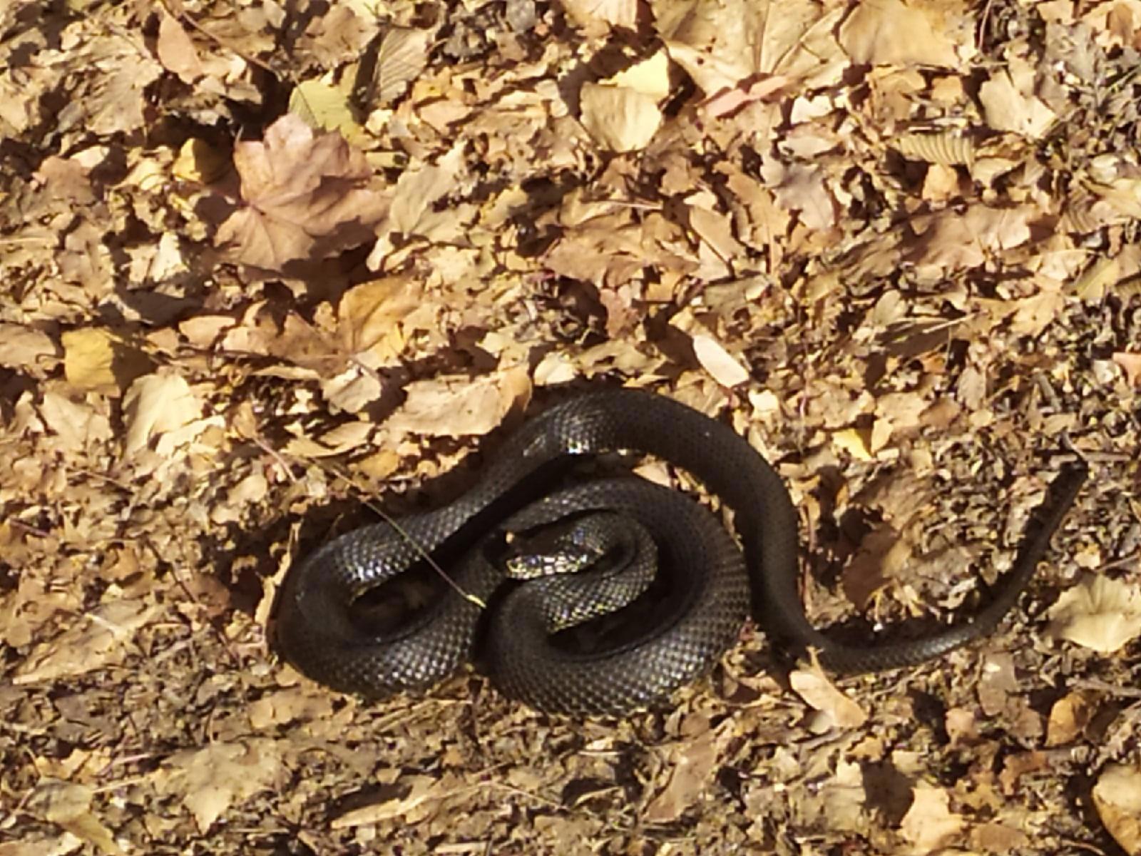 Черная гадюка - самая ядовитая из всех гадюк. Эта была примерно полметра длиной. Метра за полтора уловив вибрации от наших шаги, тут же свернулась клубком, громко зашипела, как кошка, и приготовилась к прыжку. Фото это плоховато передает, но в реале гадюка изумительно глубокого черного цвета, чешуя блестит на солнце словно смазана маслом. Опасная красота.