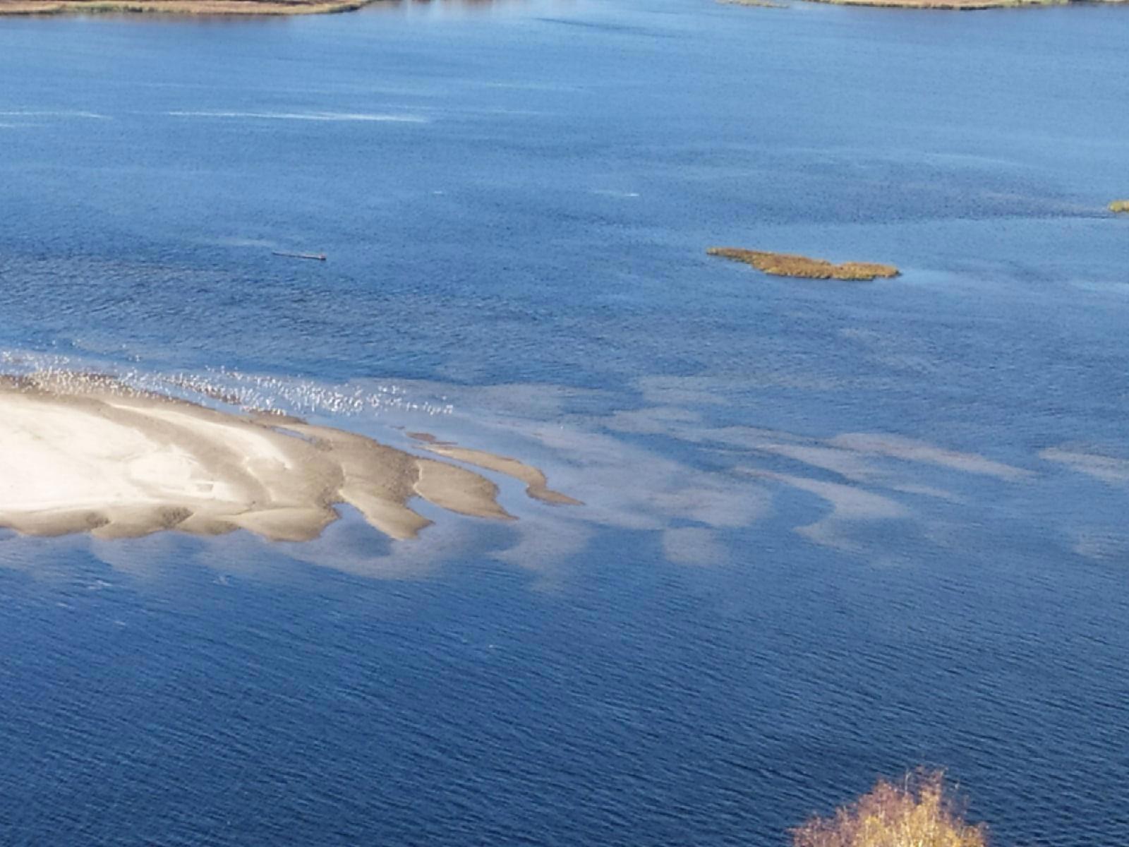 Самый первый к нам остров - Птичий. И правда, пока мы любовались прекрасным видом, большая стая чаек поднялась с его песчаной косы, покружилась над Волгой и села обратно. К сожалению, видео с телефона тут не выкладывается, поэтому фото чуть покрупнее (белые точки - те самые чайки):