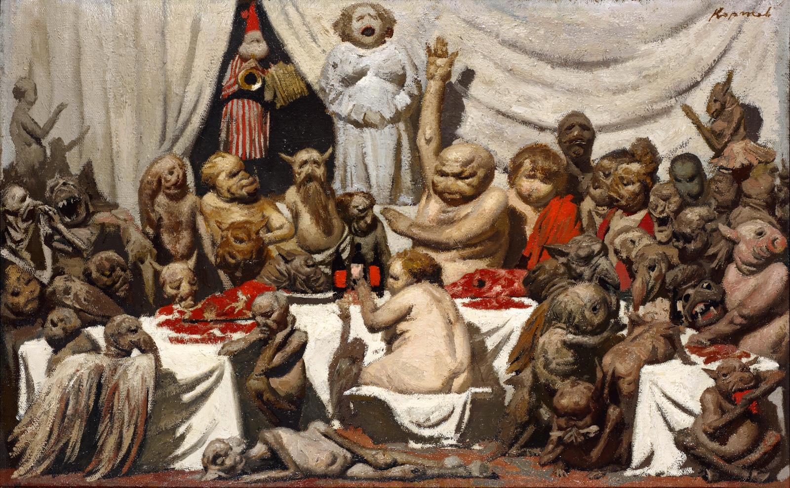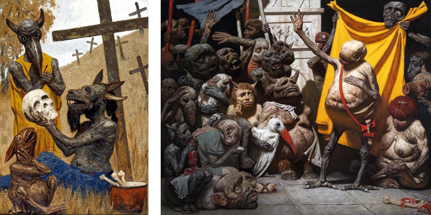Позднее творчество художника всё так же полно эмоций! Распад СССР, крушение советской утопии и угар 90-х Гелий Коржев рассматривает как пир уродливых «тюрликов», выродившихся мутантов, смешных, страшных. И чертовски напоминающих демонов Босха.