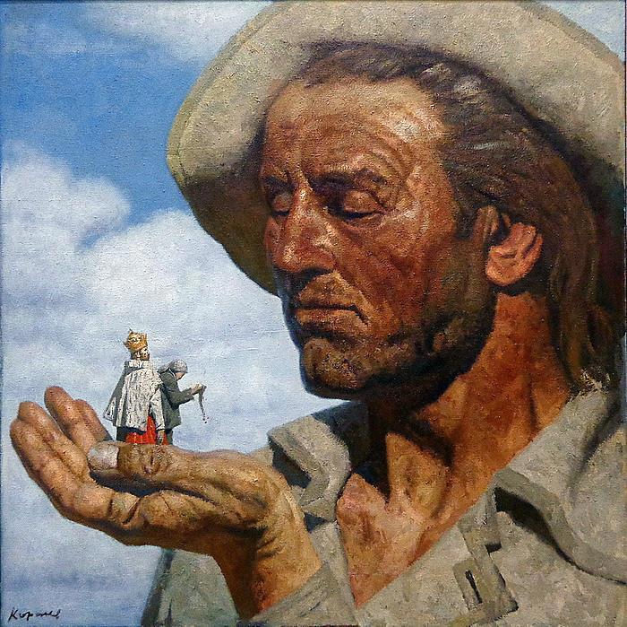 Он писал много разного, в фонде наследия Гелия Коржева — уйма эскизов, этюдов и законченных полотен. Не все удачны или однозначно прекрасны, но во всякой завершённой картине прослеживается авторская позиция. Например, «Указ короля» — вроде вольная иллюстрация к «Приключениям Гулливера», но какое в ней яркое высказывание о личной свободе!