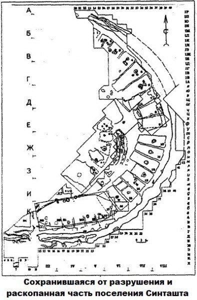 А ещё многие факты, касающиеся этих городов сами по себе, являются предметом специального рассмотрения и могут быть истолкованы очень по-разному. Вот почему, например, города в «Синташте» такие разные? Сама Синташта, найденная аж в 1968 году и названная в честь местной речки — это вообще не только городище, а ещё и «супермогильник». Тоже объект загадочный до скрежета зубовного. Вот представьте себе огроменную ступенчатую пирамиду, возведённую над захоронением одного-единственного человека. Ага... курган скифский, одна штука с кучей золотых украшений вокруг покойного? Не угадали! То есть всё так, однако никакими золотыми штучками и не пахнет — вообще с предметами дело обстоит почти никак. То есть на лицо вопиющее противоречие между колоссальными трудозатратами по строительству могильника и его внутреннем содержанием. И нет, не угадали — могильник действительно пытались грабить, однако грабители ушли с пустыми руками. Это наука говорит вполне определённо и никаких причин не доверять историкам с археологами здесь быть просто не может - ребята опытные. Версий о том, что это за деятель был похоронен на самом престижном месте «страны городов» - вагон и маленькая тележка. Называют имена от Заратуштры до Ария, но определённо все сходятся только в одном — покойный не был ни вождём, ни военачальником. Скорее всего — духовный лидер. Одноимённому городищу очень не повезло — большей частью его остатки смыло изменившимся течением реки. Вот схема того, что сохранилось от города (точнее его называют «протогородом»):