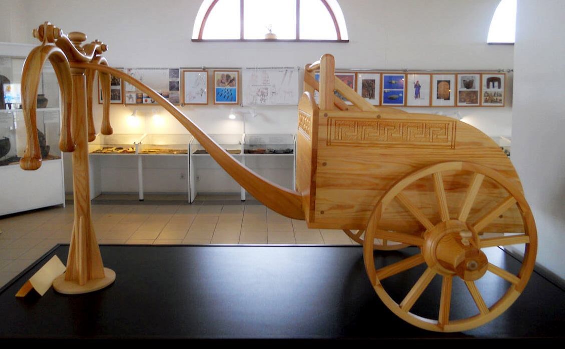 Короче я статьи про эту самую «Синташту» со всеми её входящими стараюсь не пропускать потому как там ещё копать и копать, а значит и неожиданности, почитай, гарантированы. Причём неожиданности самой высокой пробы. Например, именно в «Синташте» откопали самую древнюю на сегодняшний день колесницу. Вот её просто блестящая реконструкция в музее: