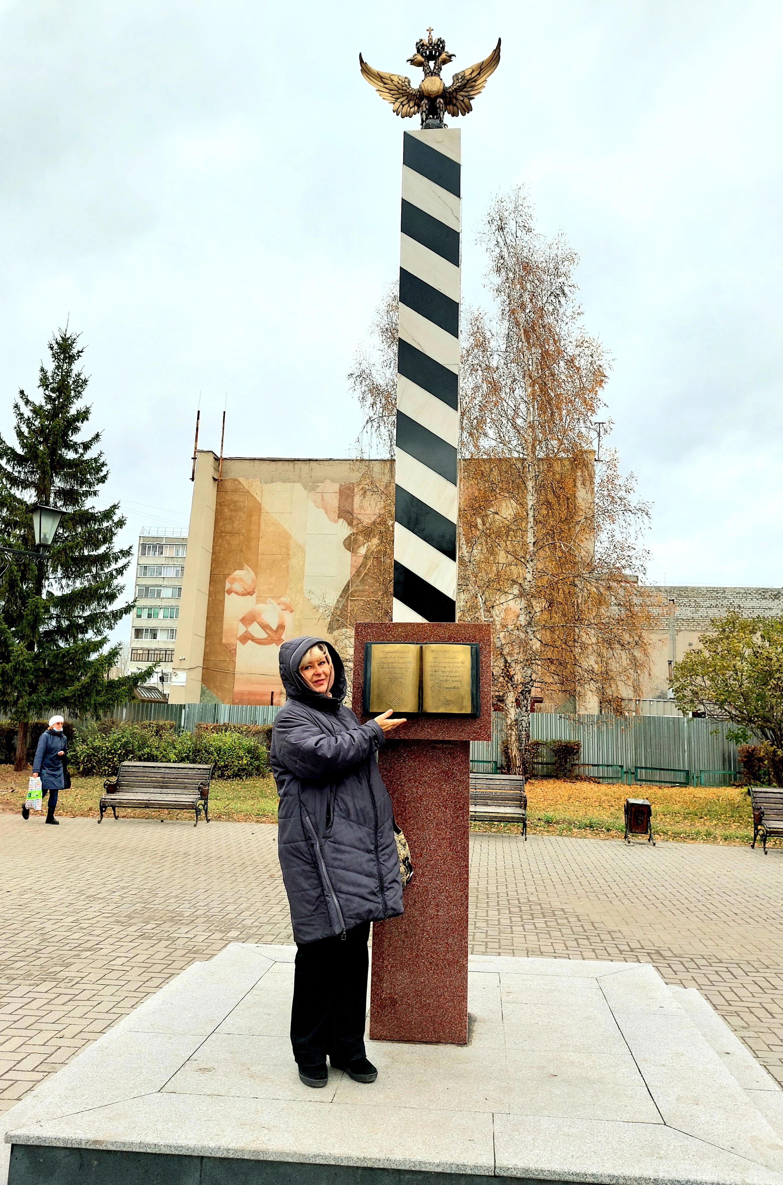 После проведения творческих встреч с читателями в центральной библиотеке нам удалось немного прогуляться. В центре города по проспекту Строителей мы увидели замечательный монумент - "Верстовой столб", высокую стеллу венчает двухглавый орёл, выкованный вручную и покрытый настоящим золотом!