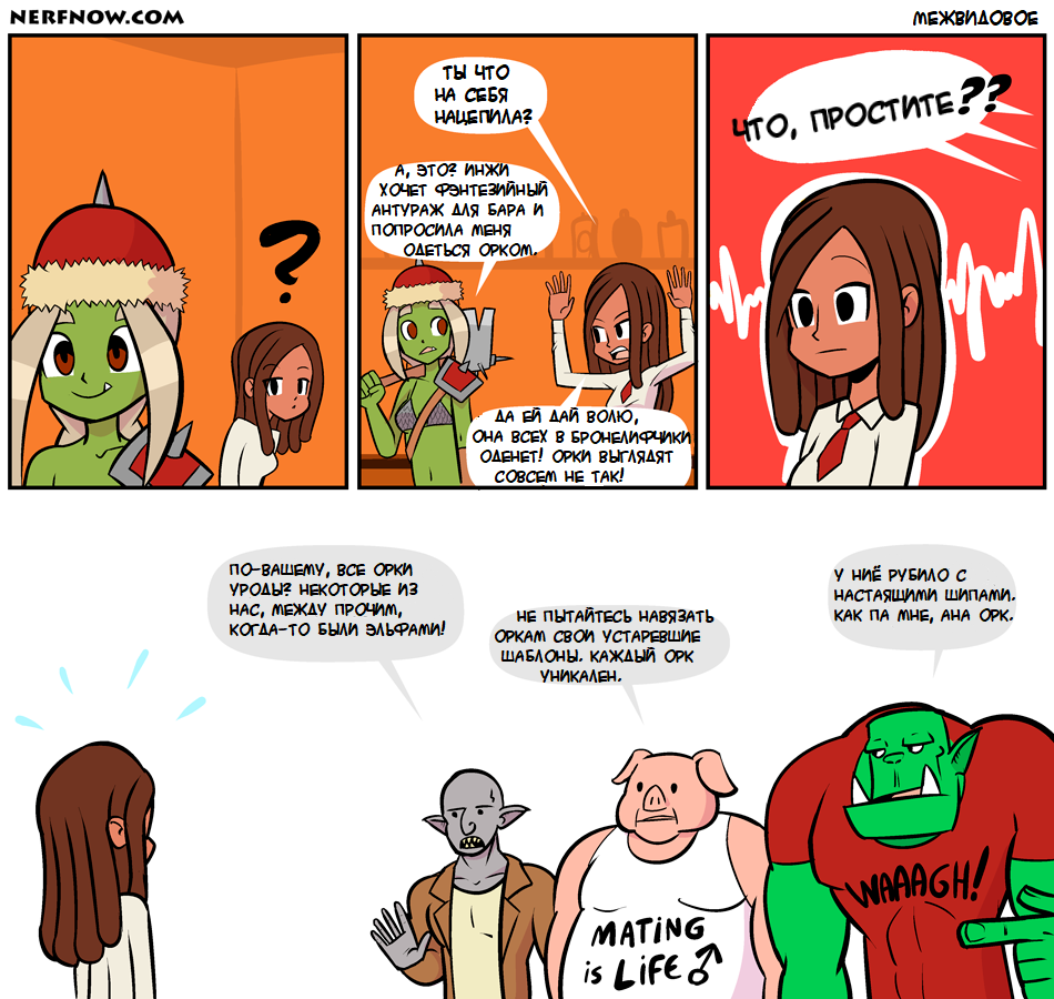Первый орк - понятное дело, из "Властелина колец", а точнее вообще толкиновского Средиземья. Третий - опять же, не секрет, из вселенной Warhammer, с соответствующими особенностями речи. Второй же, судя по футболке... скажем так, из некоторых азиатских произведений со взрослой тематикой %)