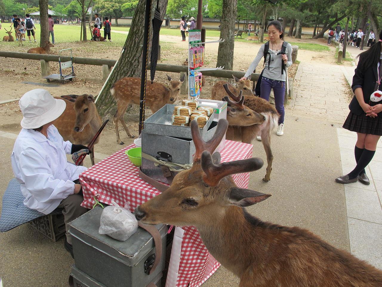 Столь близкое соседство людей с оленями постоянно приводило к гибели последних, поэтому местные и центральные власти строго следили, чтобы люди не обижали небесных животных. За их убийство даже приговаривали к смертной казни. Ныне оленей Нары обижают крайне редко. Скорее уж олени иногда ранят людей. За восемь лет, с 2010 до 2017 годы, десять человек получили переломы из-за ударов рогов и копыт рассерженных оленей и не менее сотни человек были укушены. Но такое случается только в том случае, если оленя разозлили. Обычно же они — милейшие создания, которые вежливо просят угостить их особым печеньем. Печенье продаётся тут же на улицах.