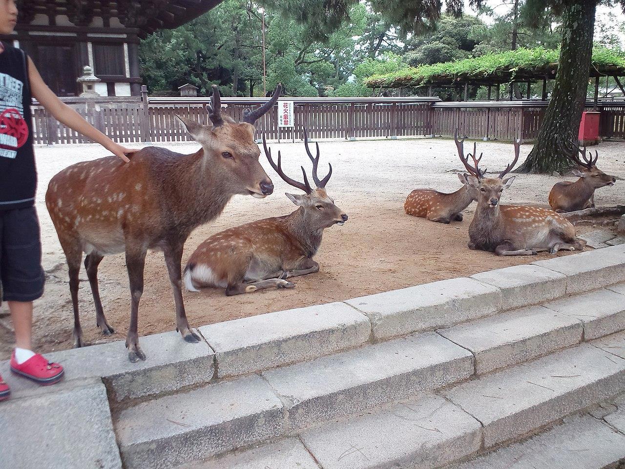 По легенде, бог грома и меча Такэмикадзути прибыл в Нару на белом олене, чтобы охранять недавно построенную столицу Хейдзё-кё. С тех пор пятнистые олени Нары считаются небесными животными, защищающими город и страну, потомками того самого белого оленя.